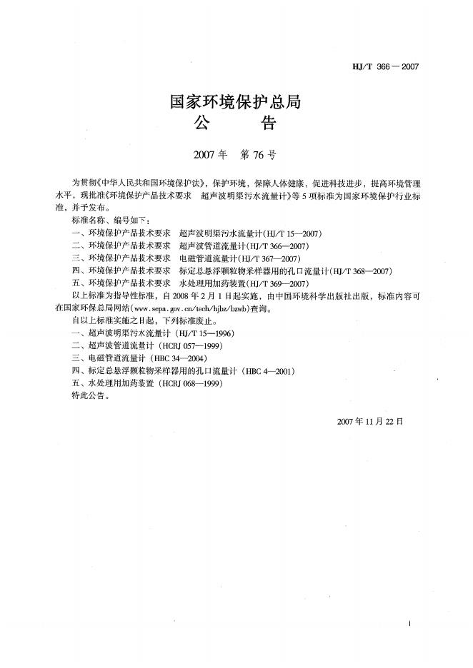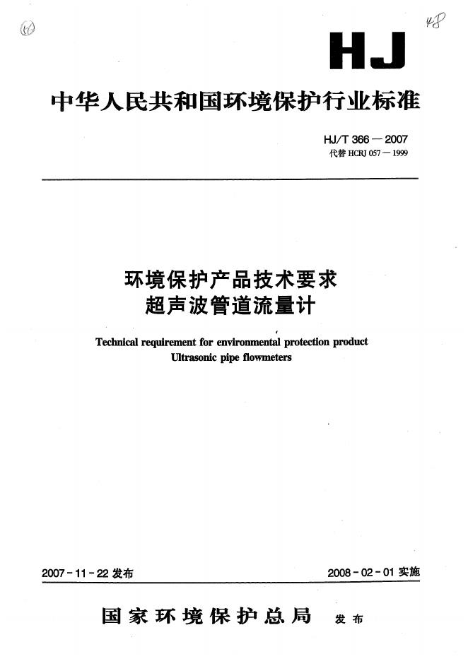 HJ/T 366-2007 环境保护产品技术要求 超声波管道流量计