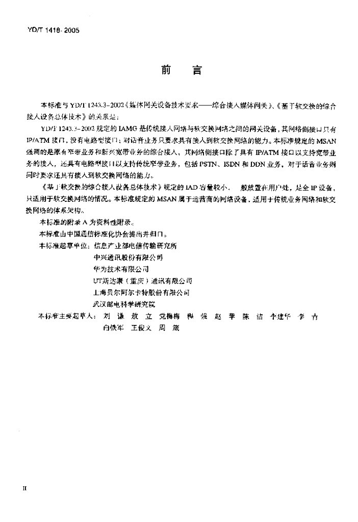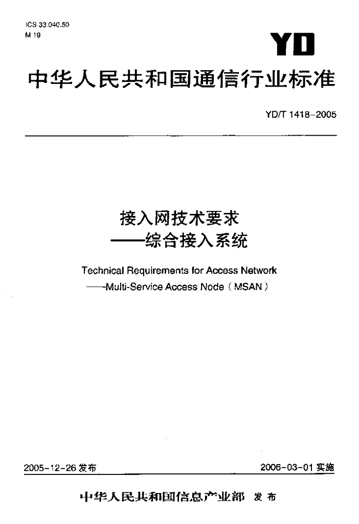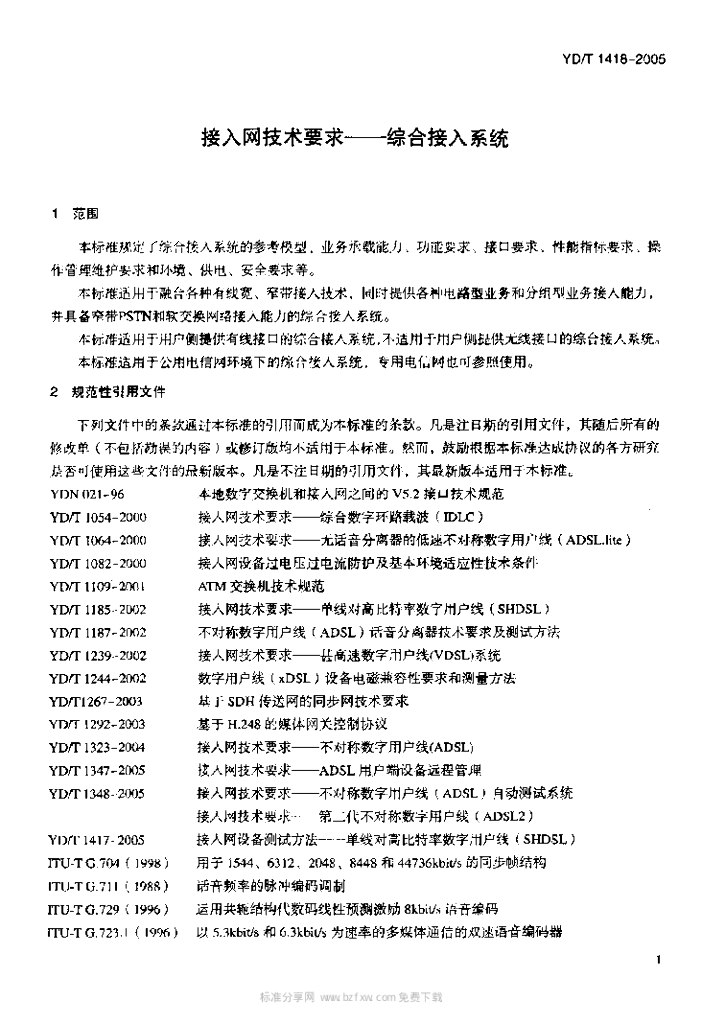 YD/T 1418-2005 接入网技术要求——综合接入系统