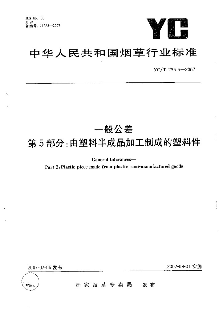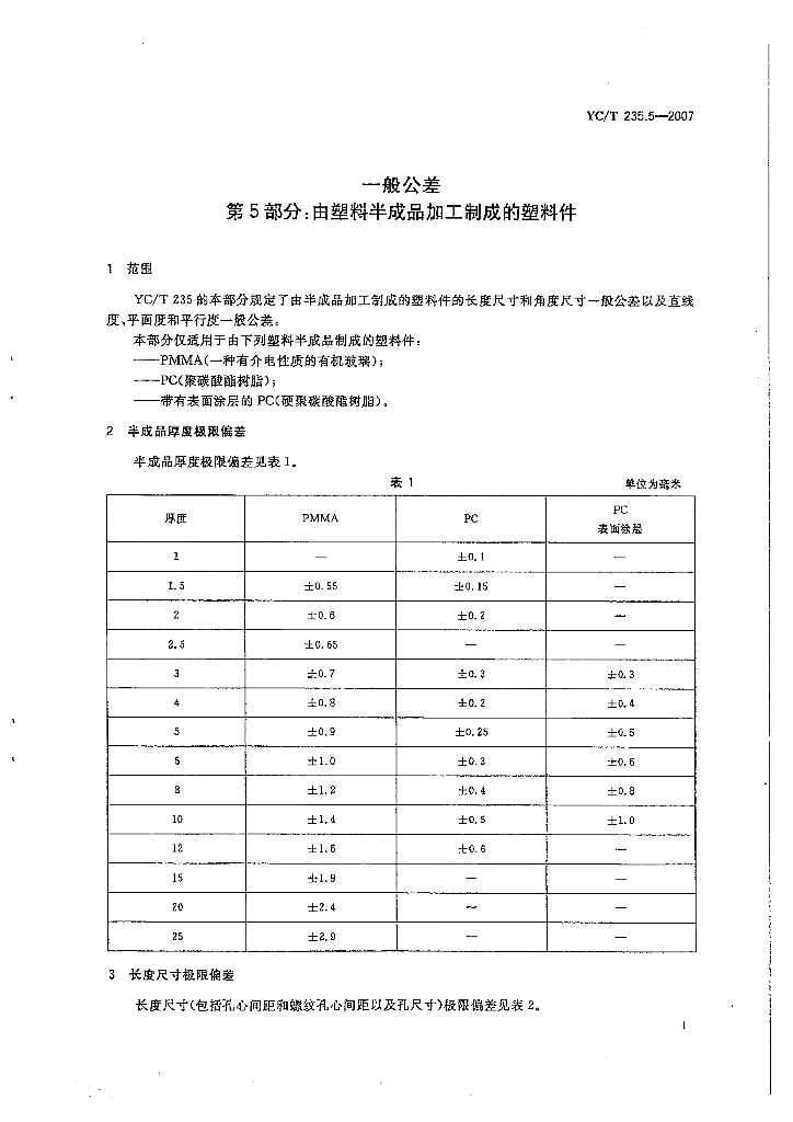 YC/T 235.5-2007 一般公差 第5部分:由塑料半成品加工制成的塑料件