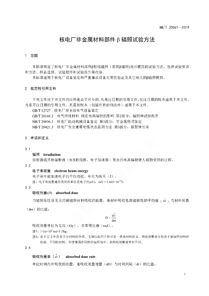 NB/T 20561-2019 核电厂非金属材料部件β 辐照试验方法