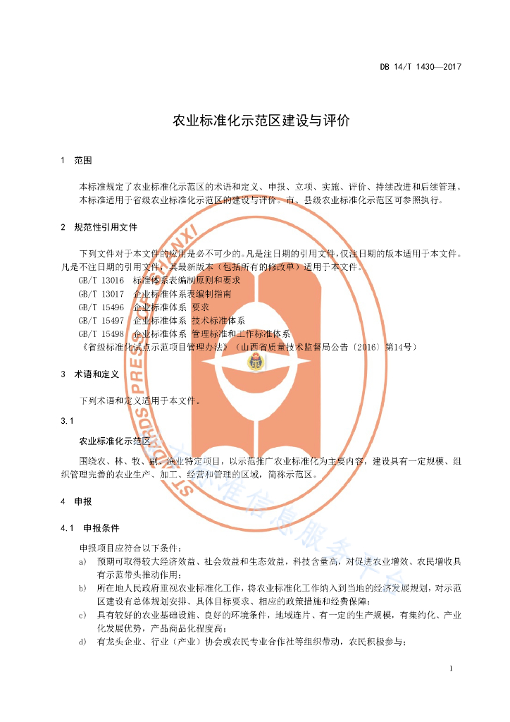 DB14/T 1430-2017 农业标准化示范区建设与评价