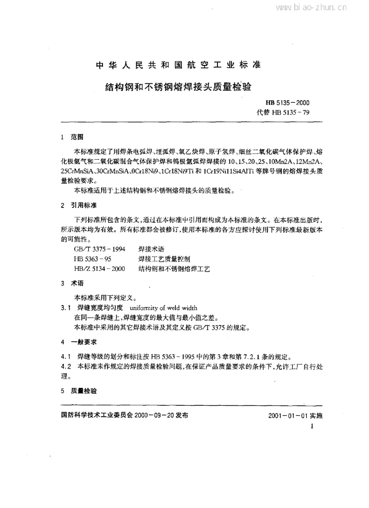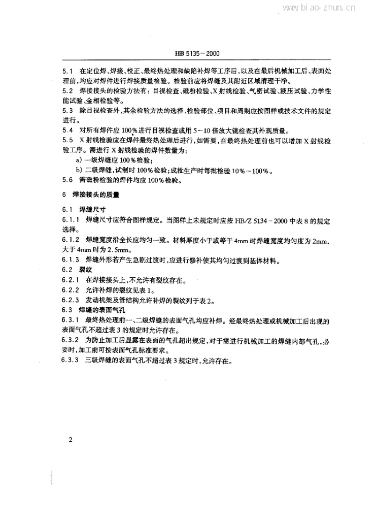 HB 5135-2000 结构钢和不锈钢熔焊接头质量检验