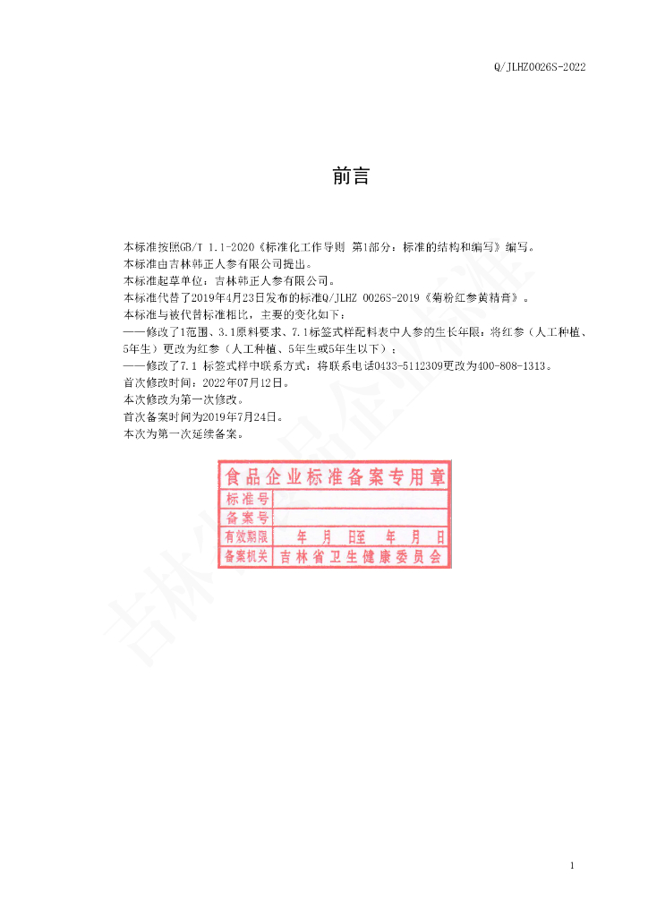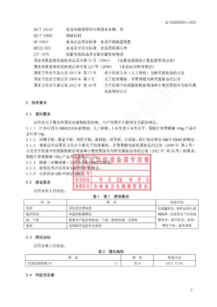 Q/JLHZ 0026S-2022 菊粉红参黄精膏