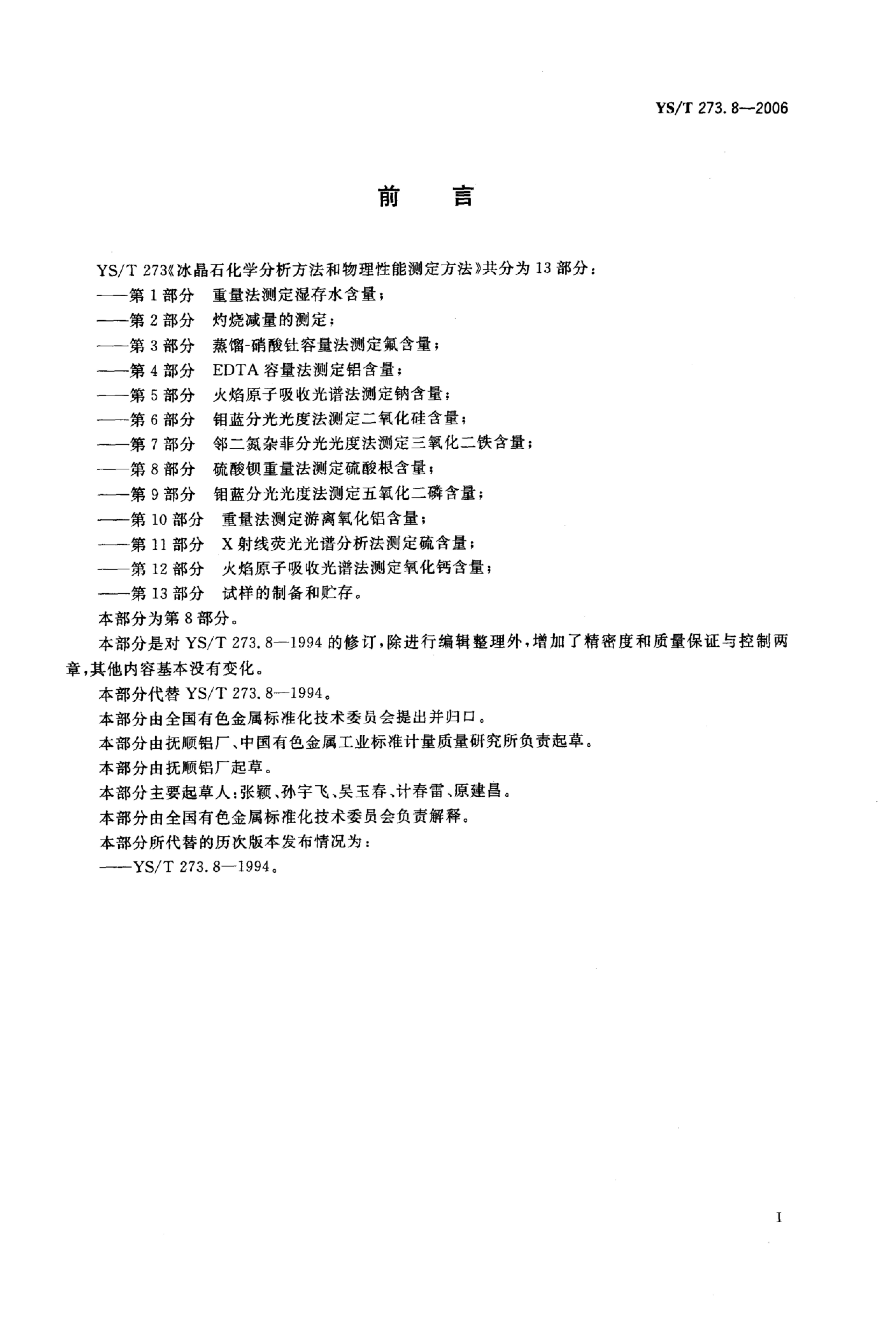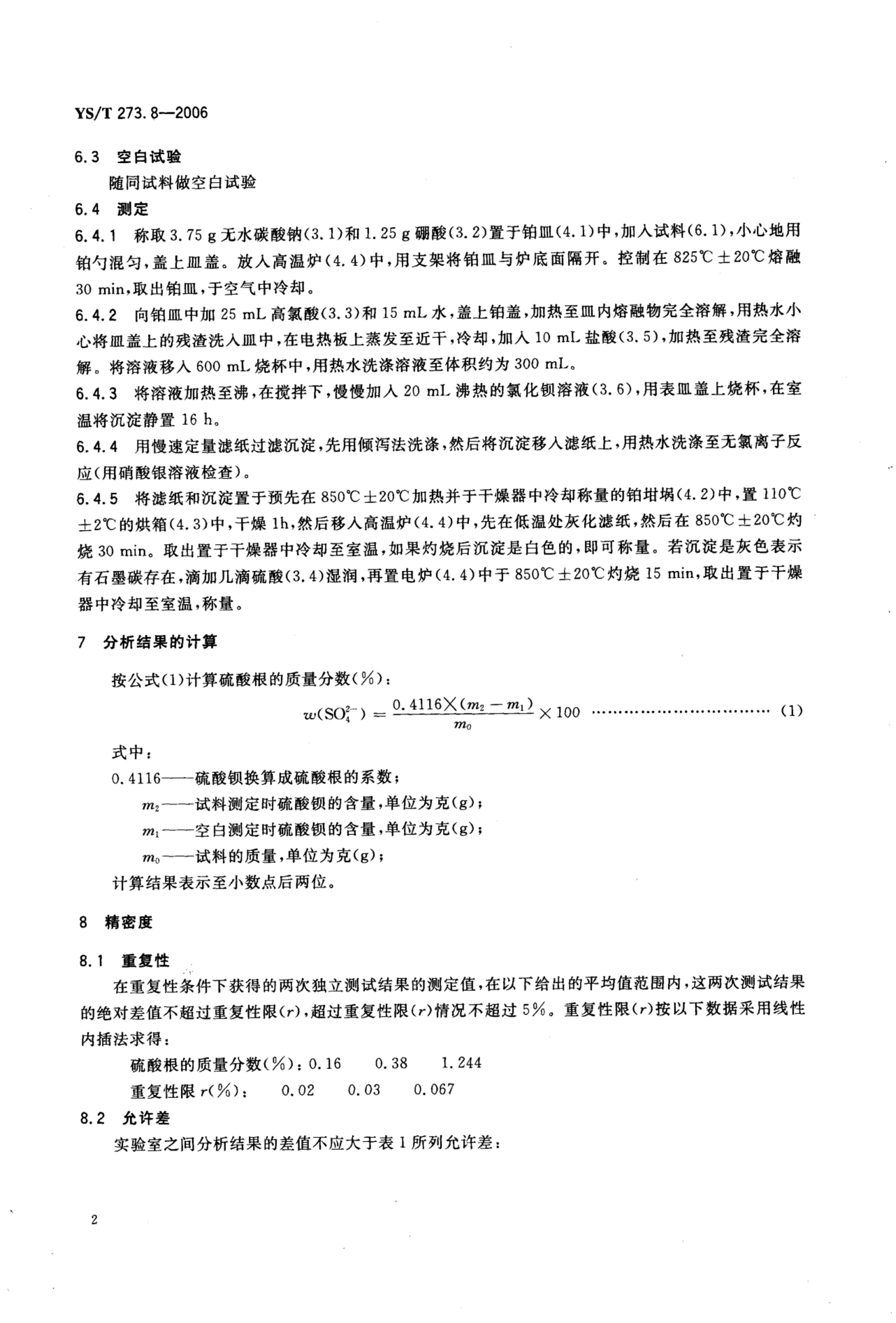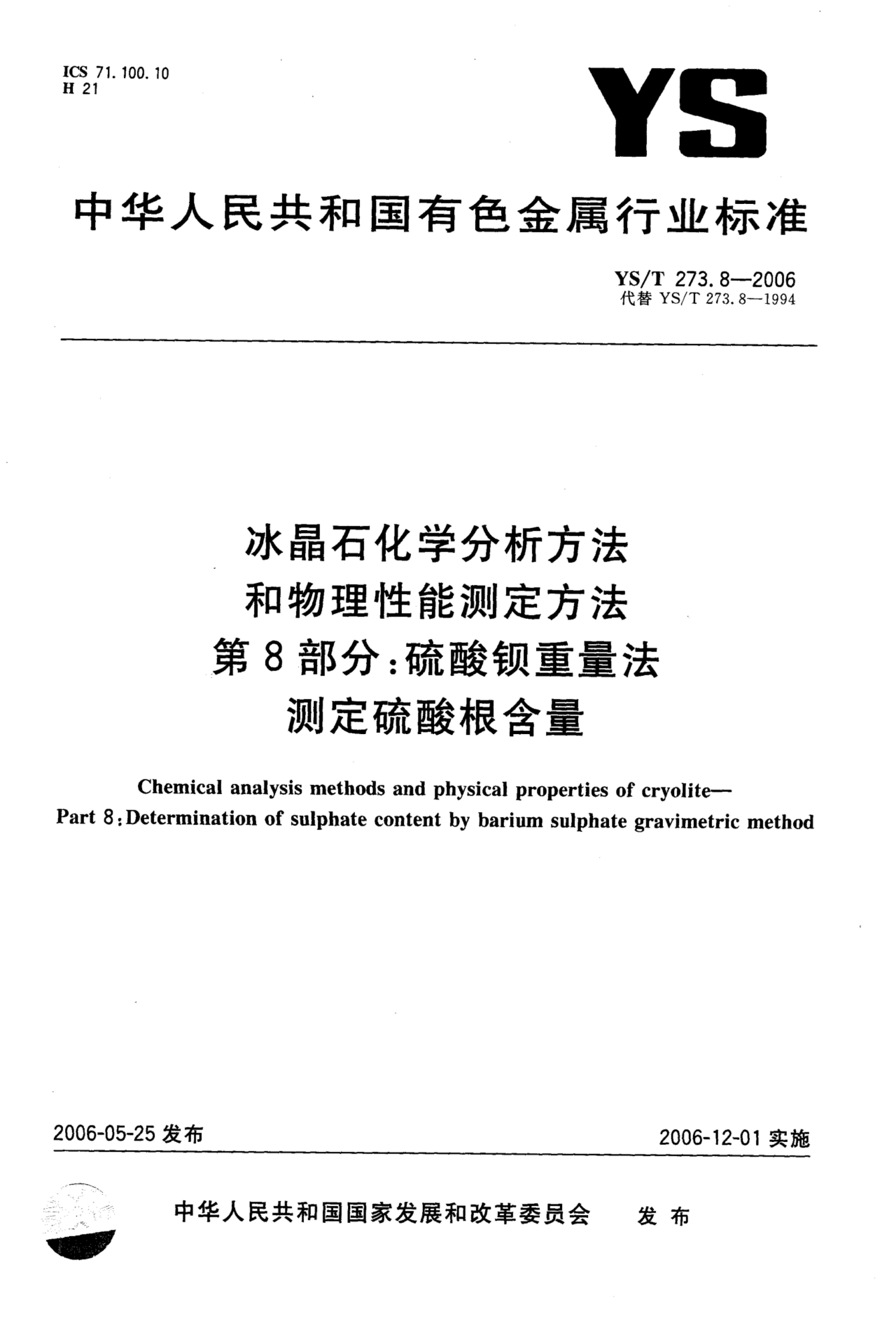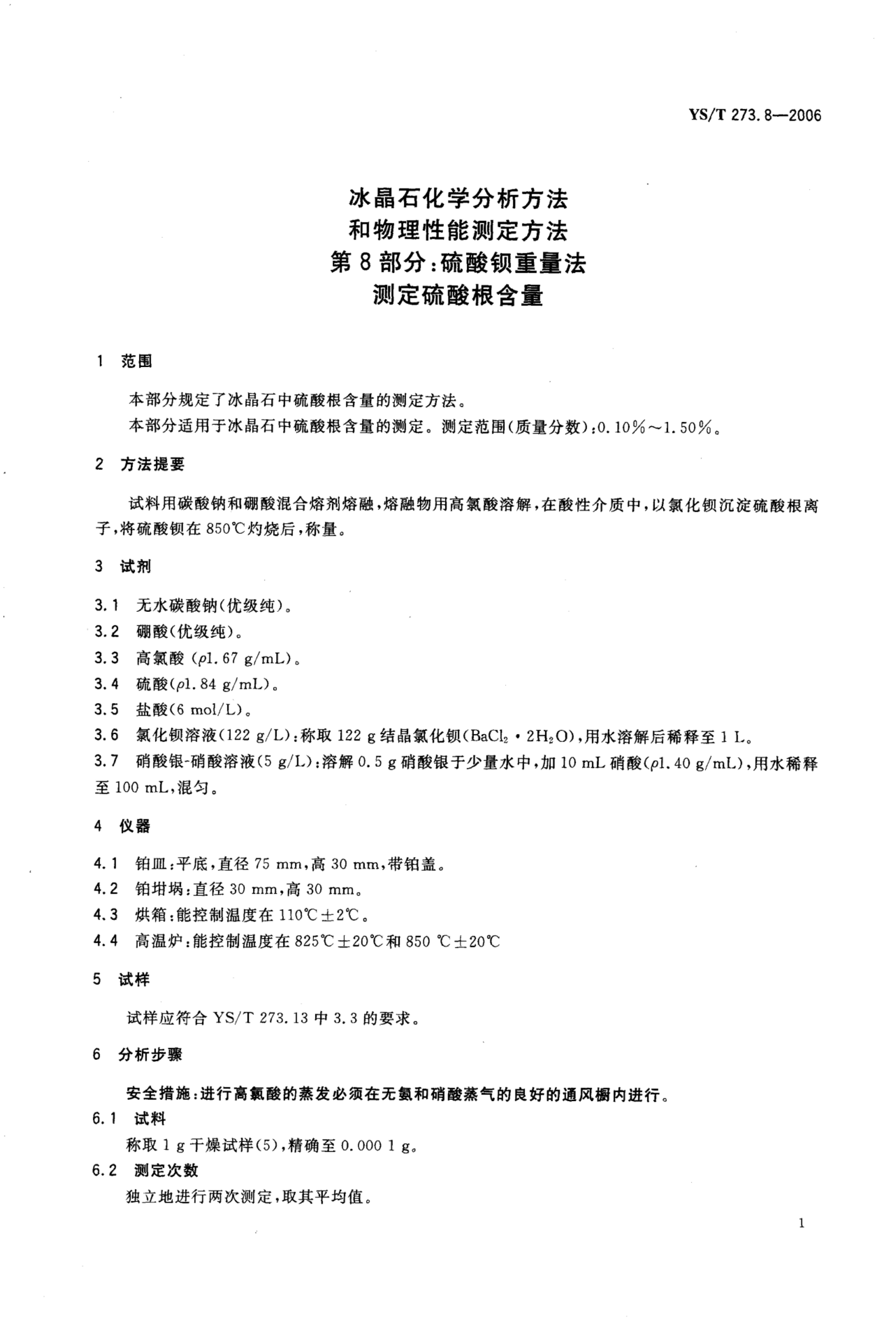 YS/T 273.8-2006 冰晶石化学分析方法和物理性能测定方法 第8部分:硫酸钡重量法测定硫酸根含量