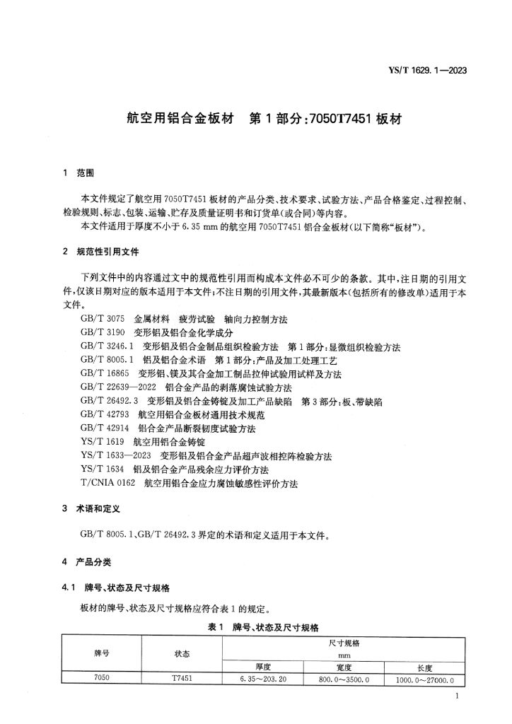 YS/T 1629.1-2023 航空用铝合金板材 第1部分:7050T7451板材