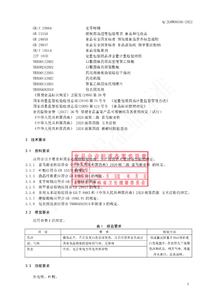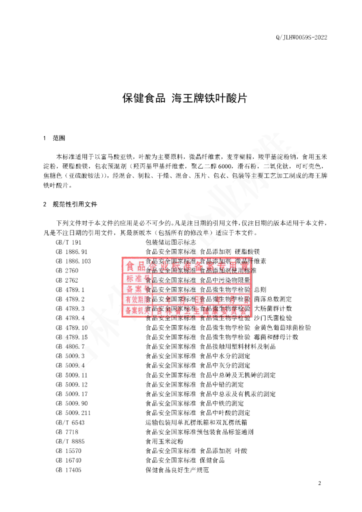 Q/JLHW 0059S-2022 保健食品 海王牌铁叶酸片