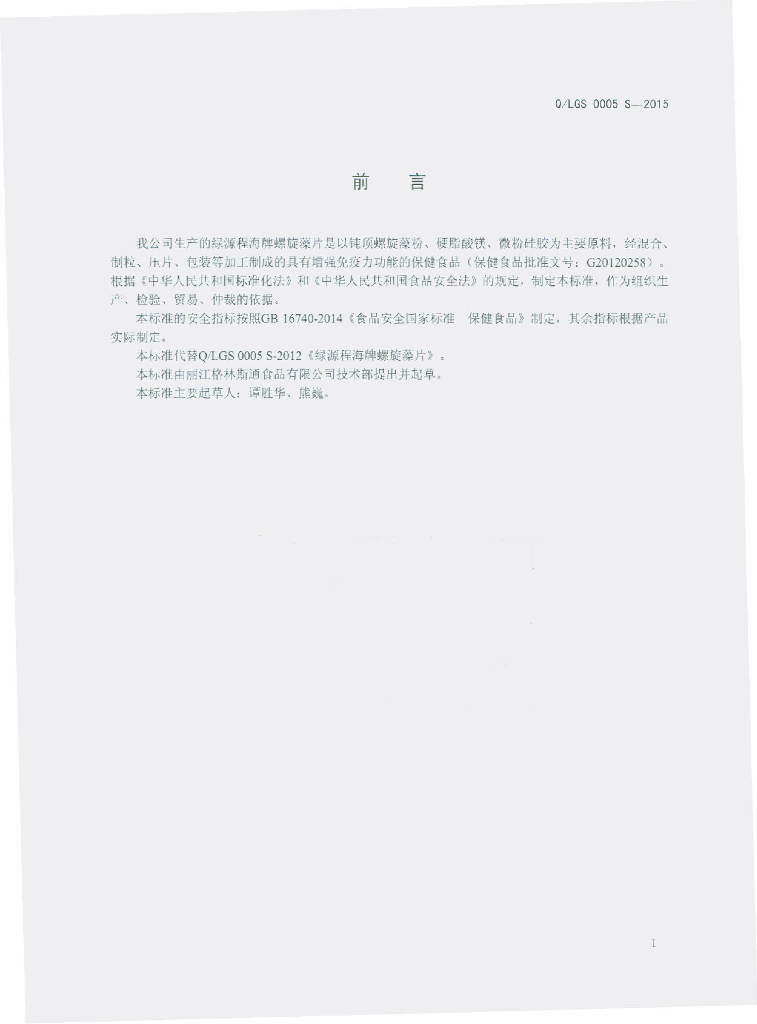 Q/LGS 0005S-2015 丽江格林斯通食品有限公司 绿源程海牌螺旋藻片