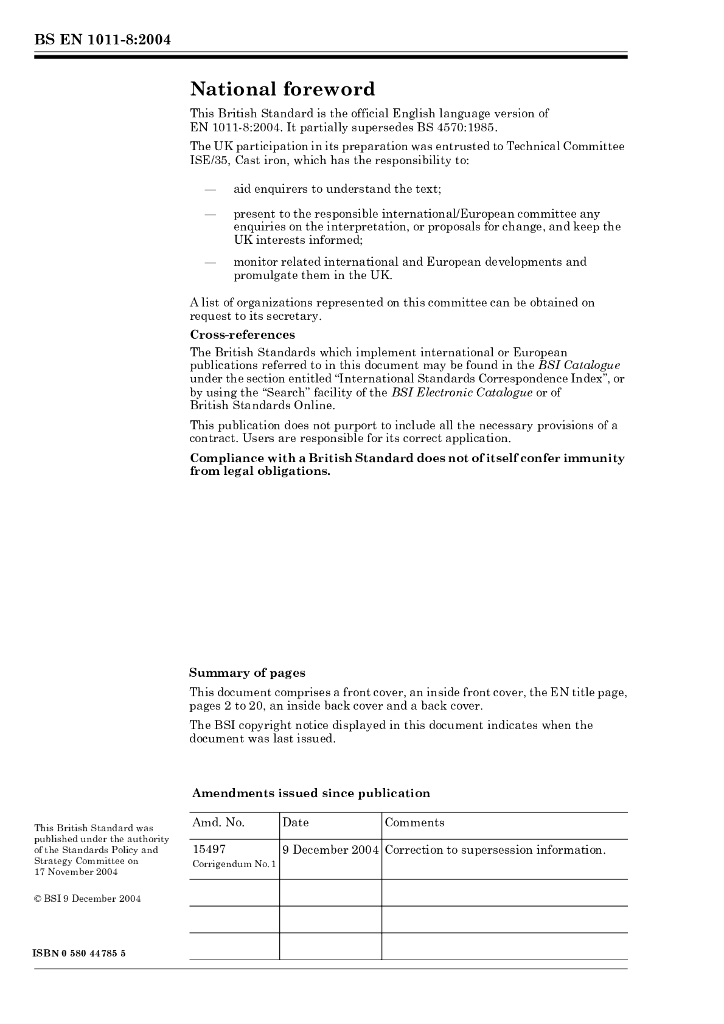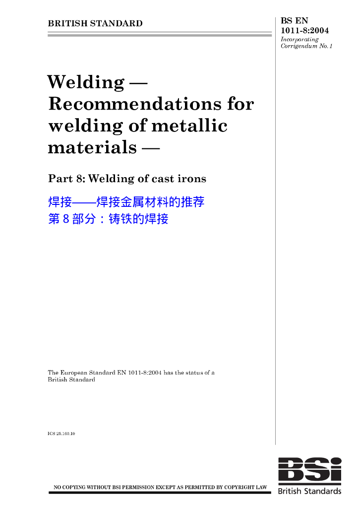 BS EN 1011-8-2004 焊接 焊接金属材料的推荐 第8部分:铸铁的焊接