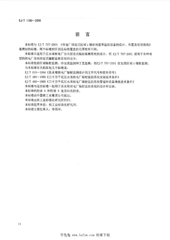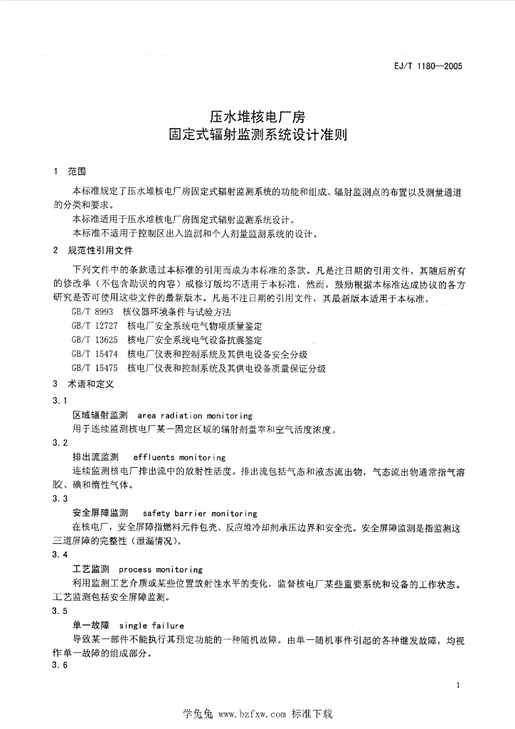EJ/T 1180-2005 压水堆核电厂房固定式辐射监测系统设计准则