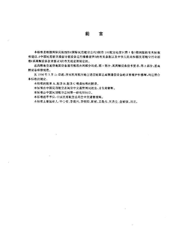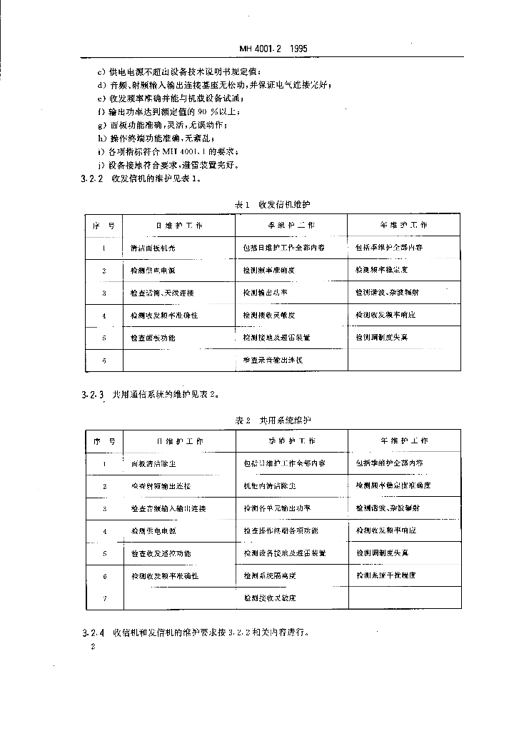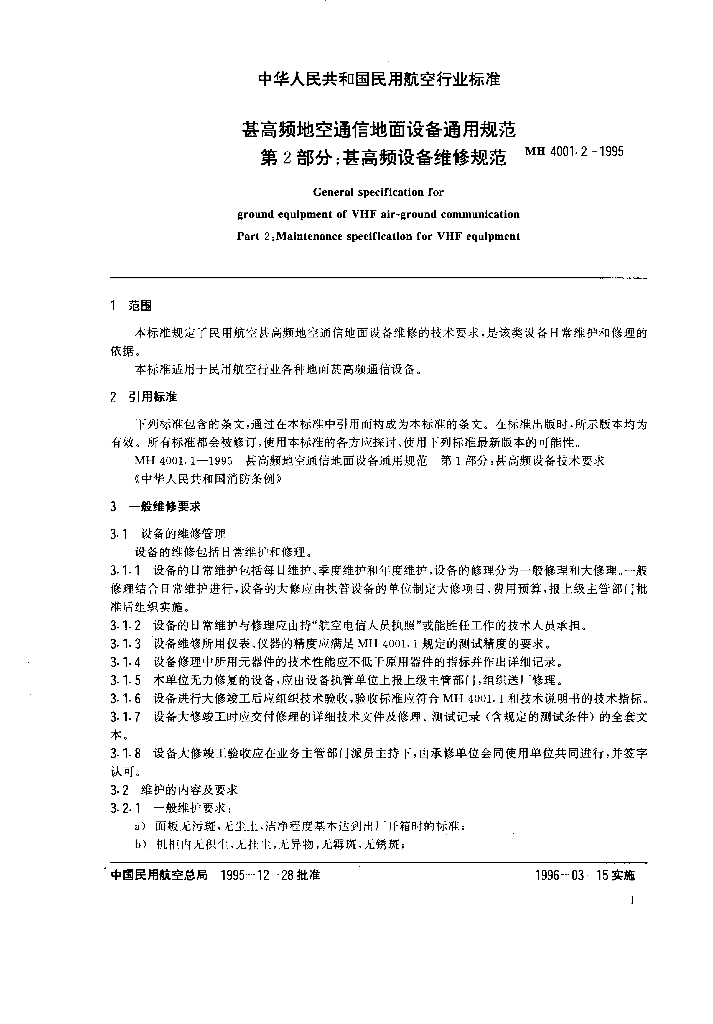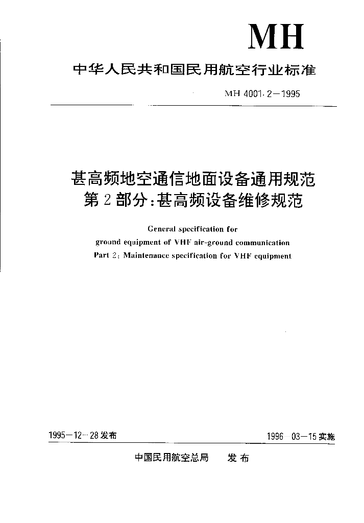 MH/T 4001.2-1995 甚高频地空通信地面设备通用规范 第2部分:甚高频设备维修规范