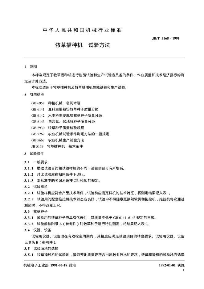 JB/T 5168-1991 牧草播种机 试验方法