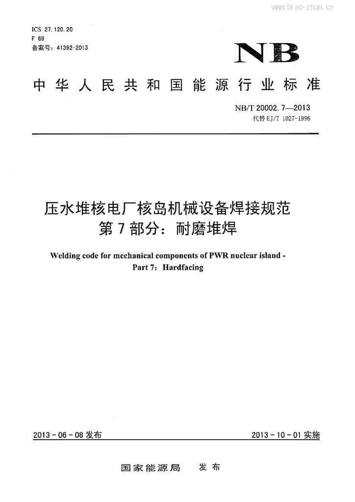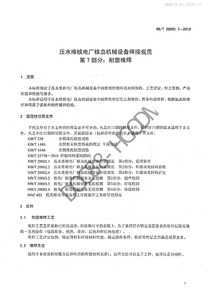 NB/T 20002.7-2013 压水堆核电厂核岛机械设备焊接规范 第7部分:耐磨堆焊