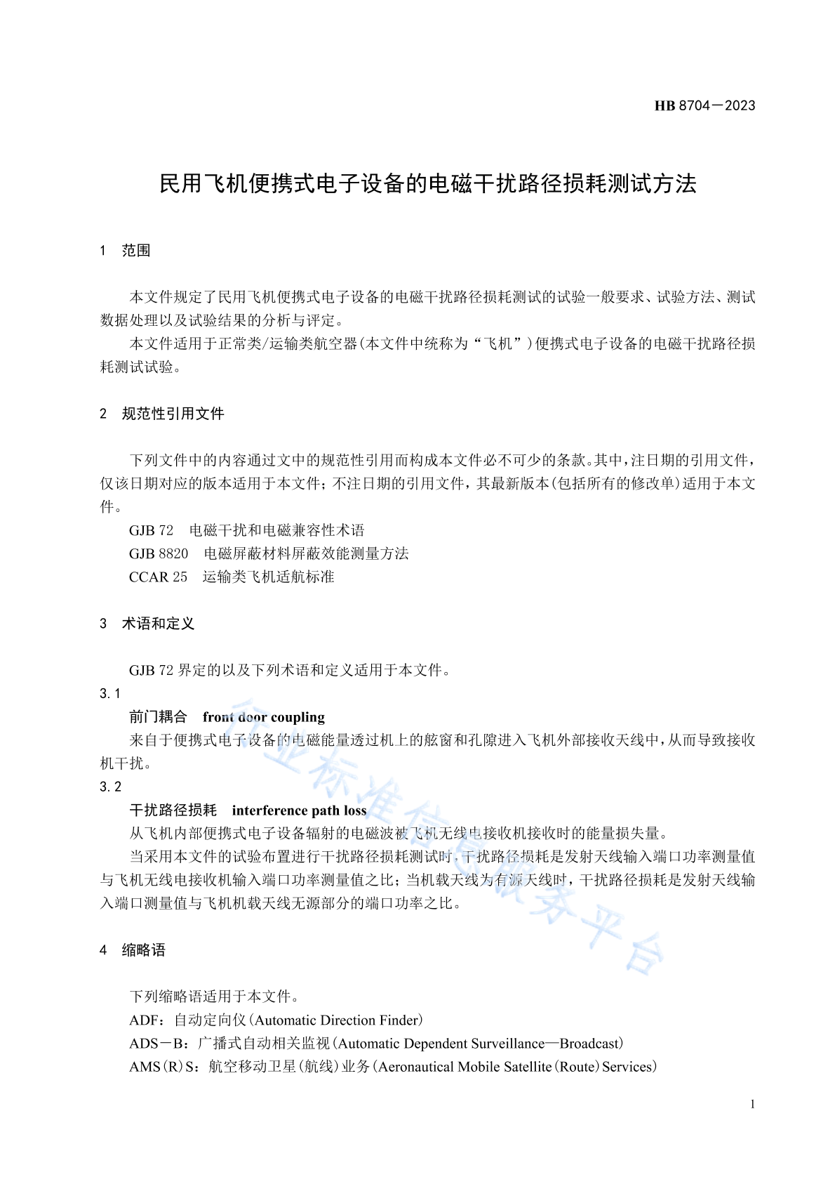 HB 8704-2023 民用飞机便携式电子设备的电磁干扰路径损耗测试方法