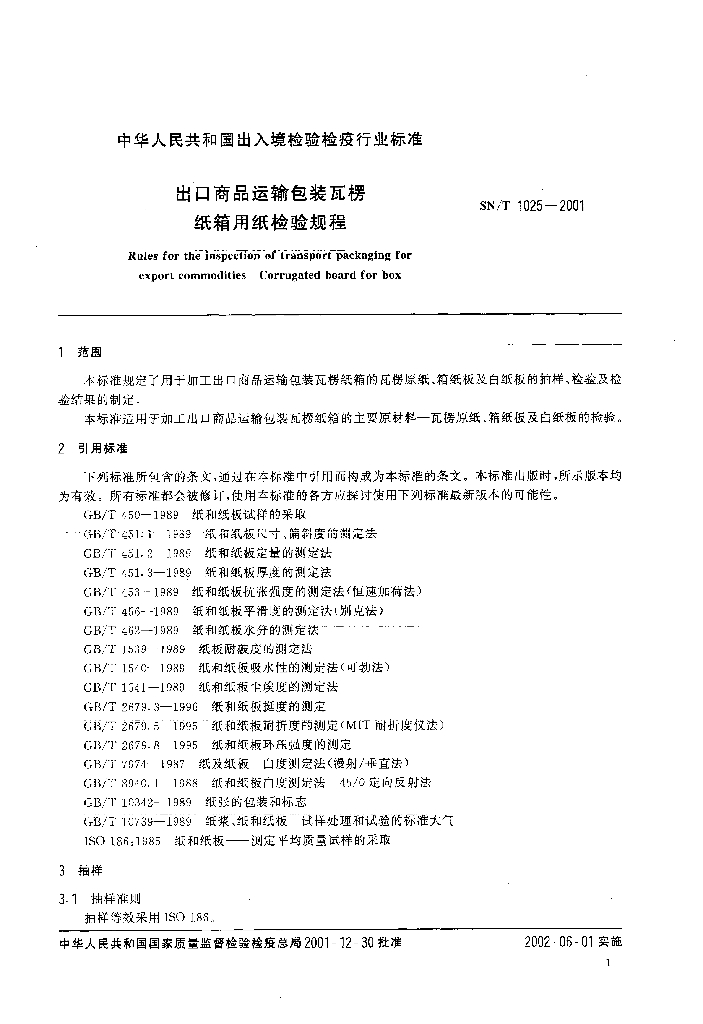 SN/T 1025-2001 出口商品运输包装瓦楞纸箱用纸检验规程