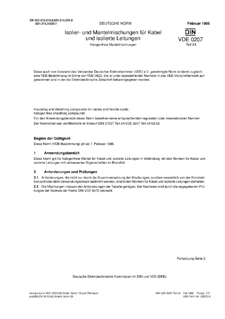 DIN VDE 0207-24-1986 电缆和软线绝缘和护套材料-无卤护套混料