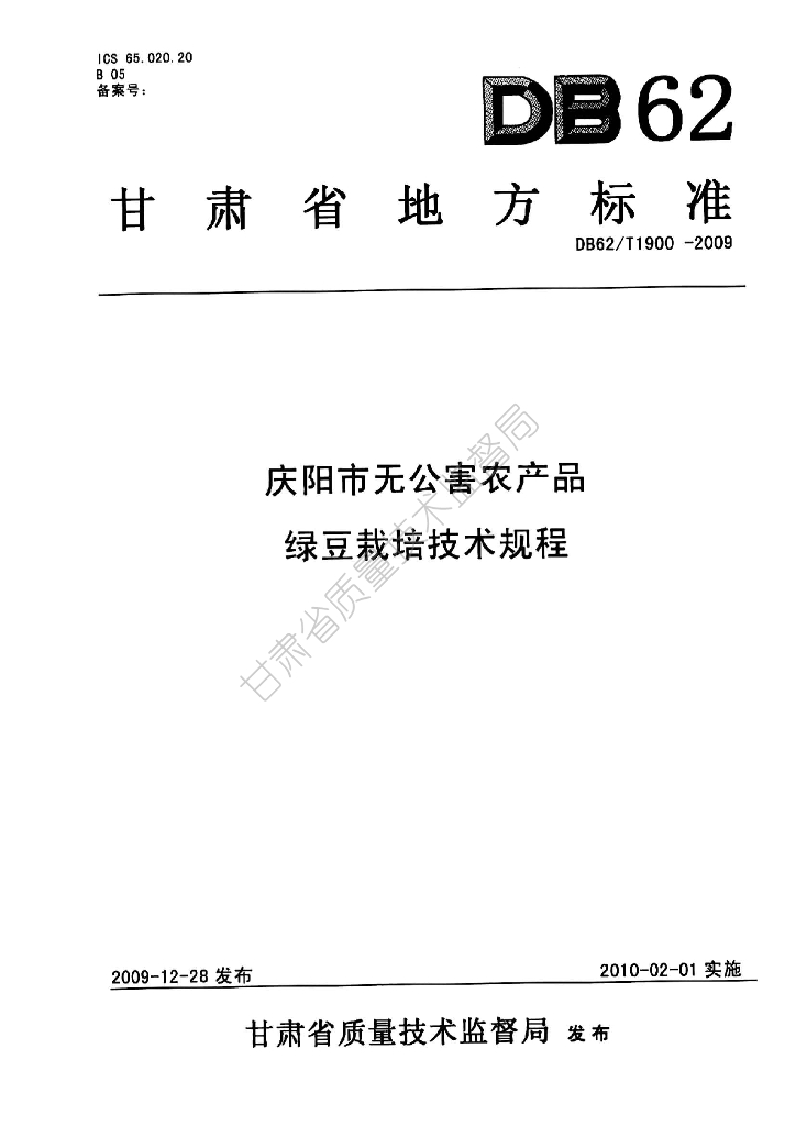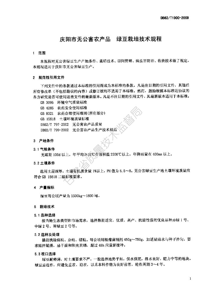 DB62/T 1900-2009 庆阳市无公害农产品绿豆栽培技术规程