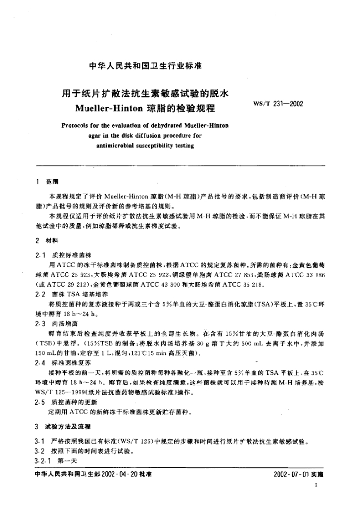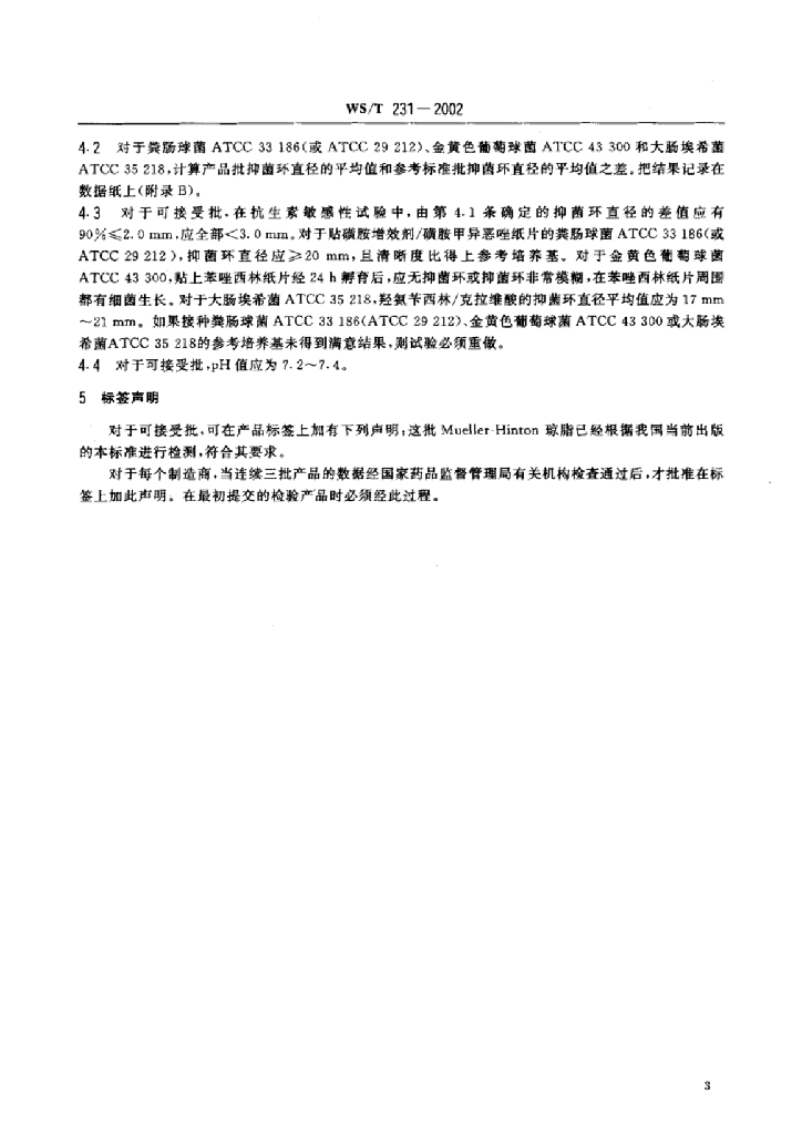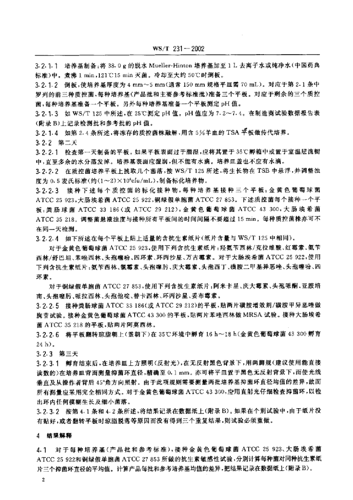 WS/T 231-2002 用于纸片扩散法抗生素敏感试验的脱水Mueller-Hinton琼脂的检验规程
