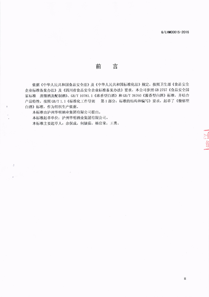 Q/LHM 0001S-2016 泸州华明酒业集团有限公司 馥郁型白酒