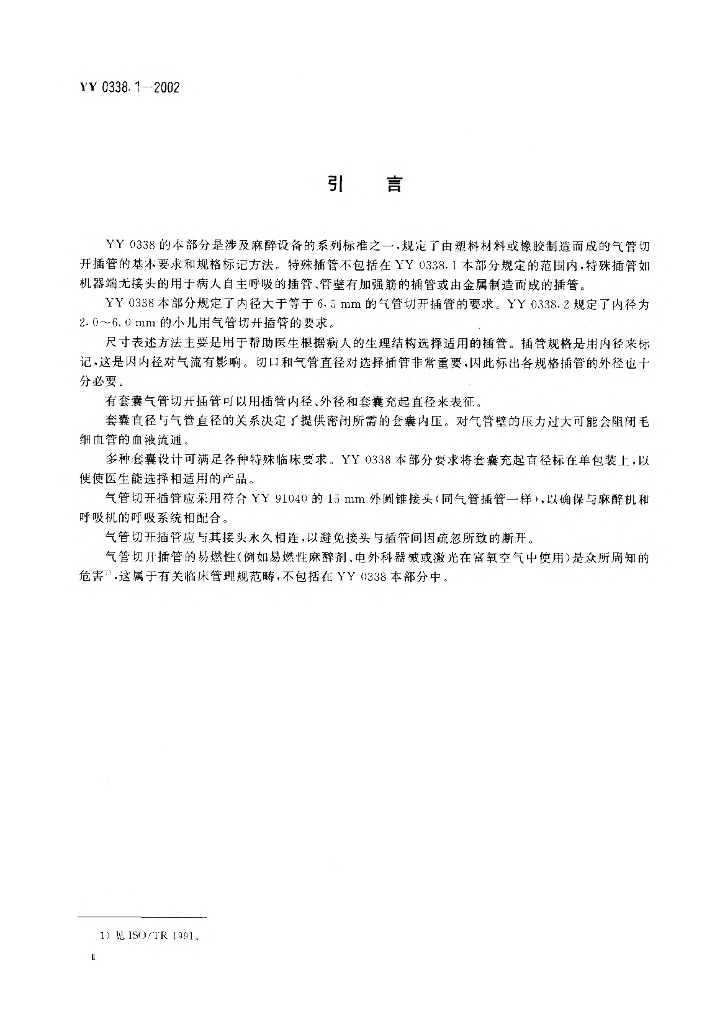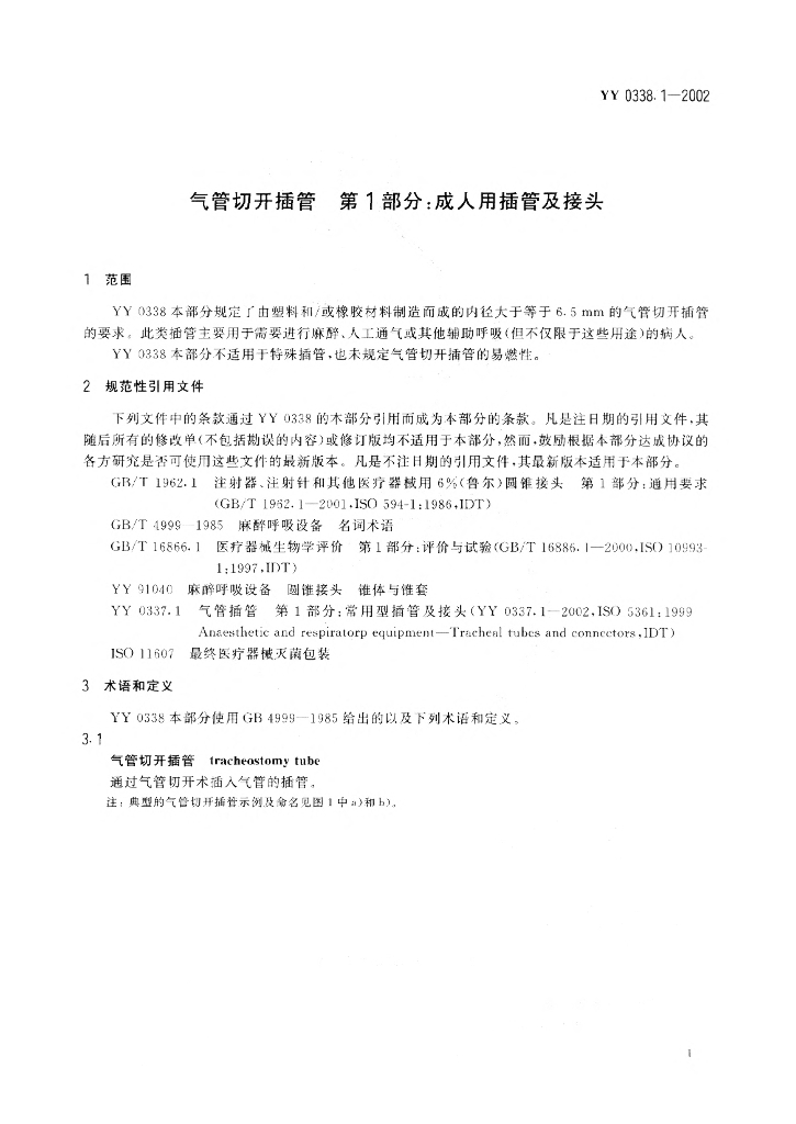 YY/T 0338.1-2002 气管切开插管 第1部分:成人用插管及接头