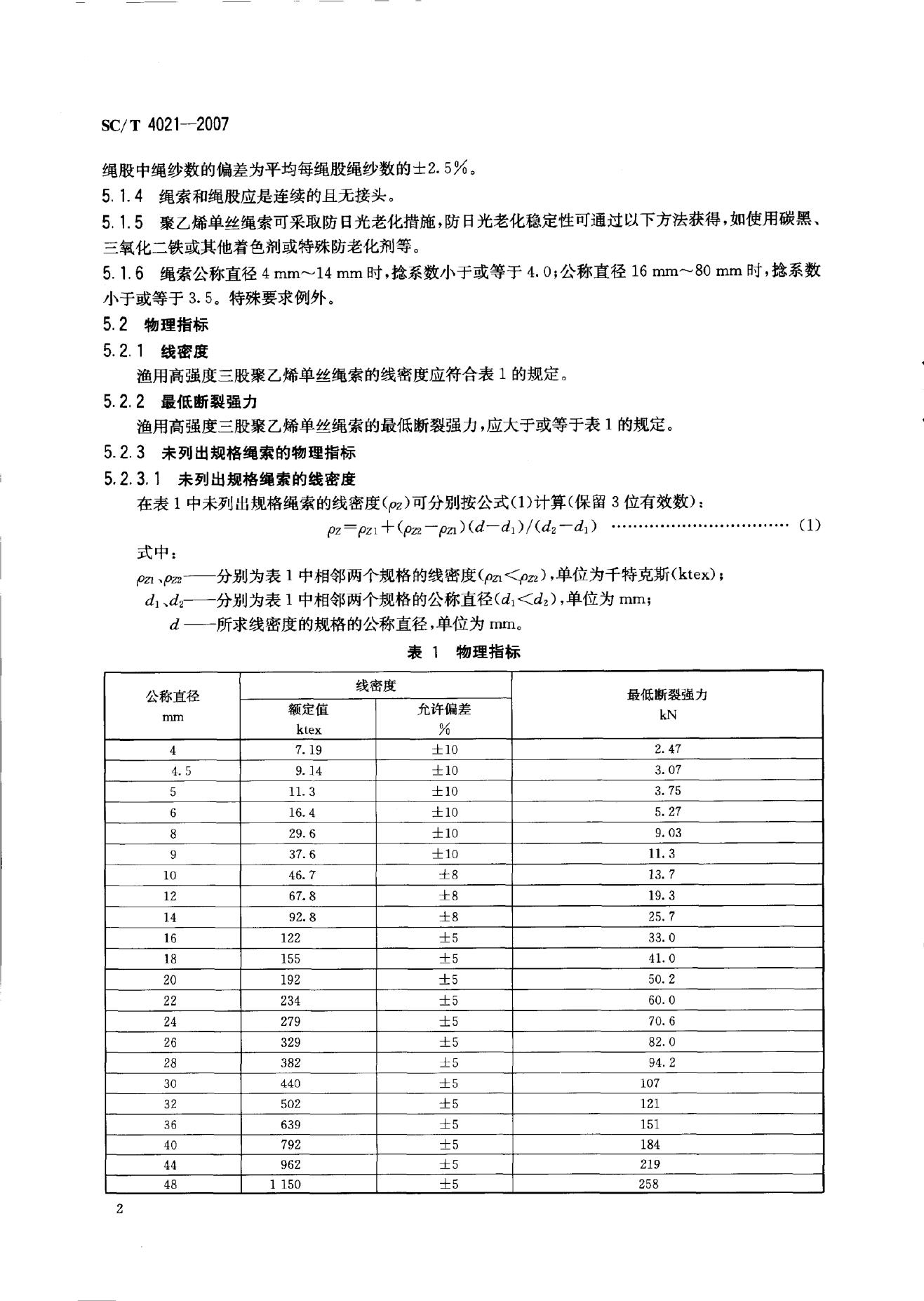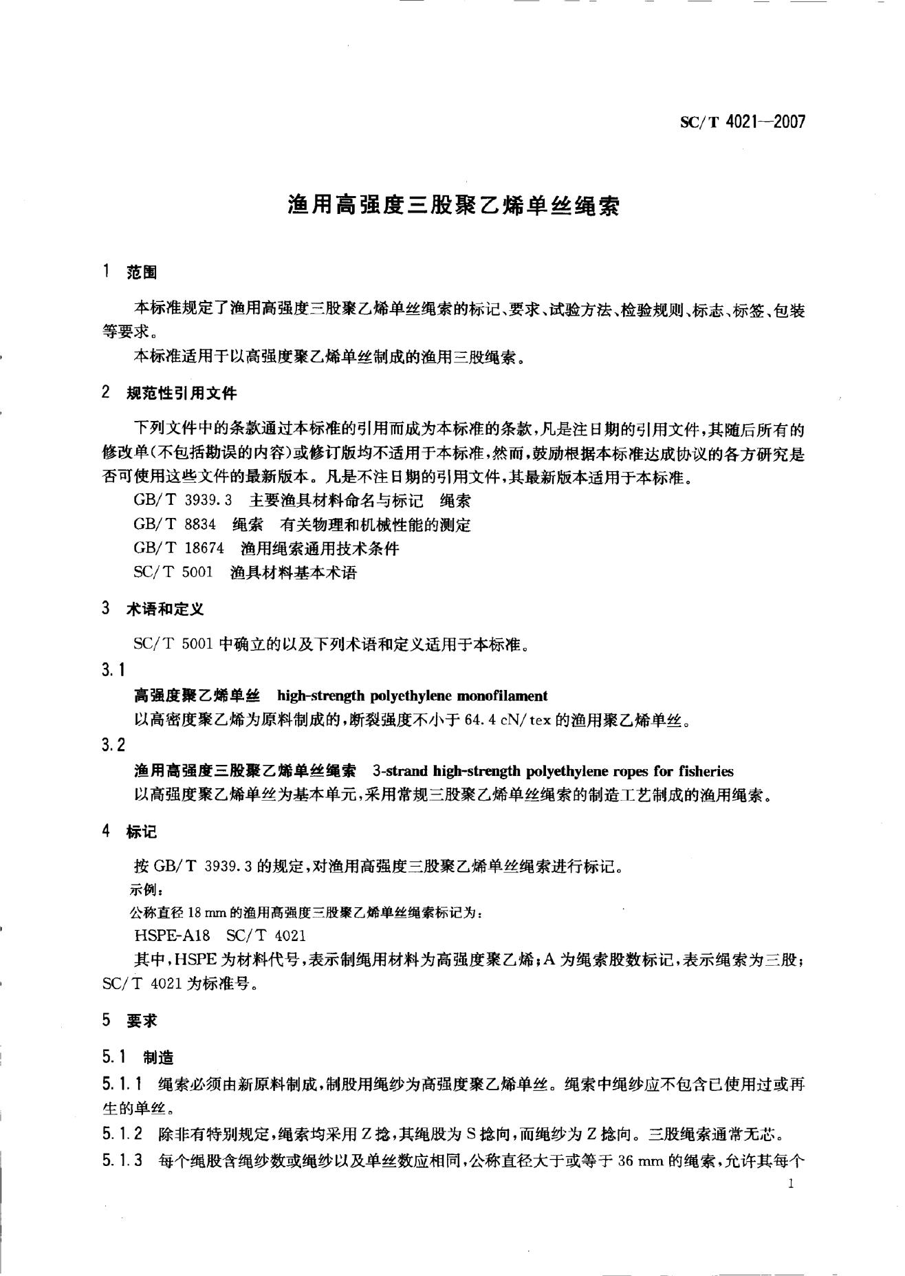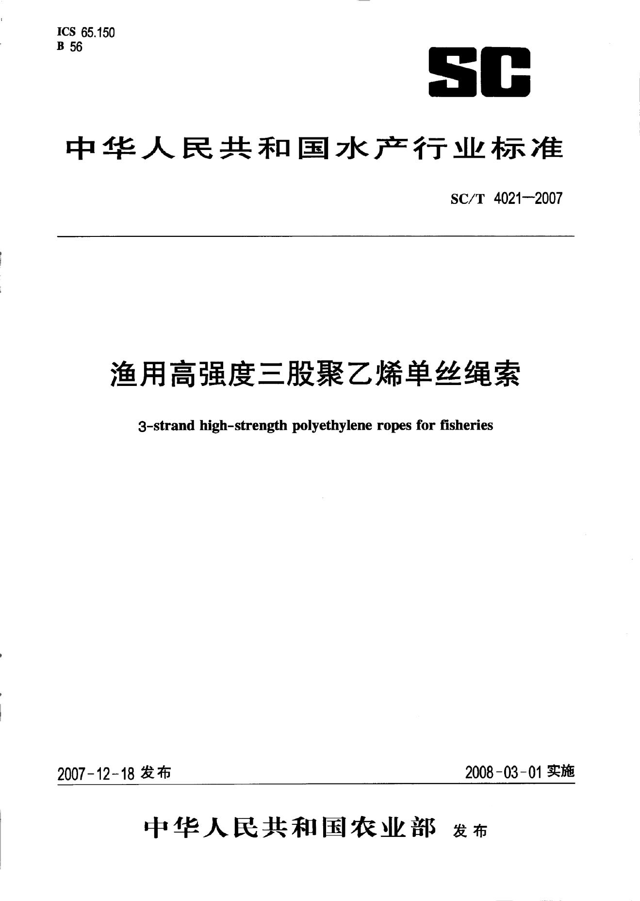 SC/T 4021-2007 渔用高强度三股聚乙烯单丝绳索