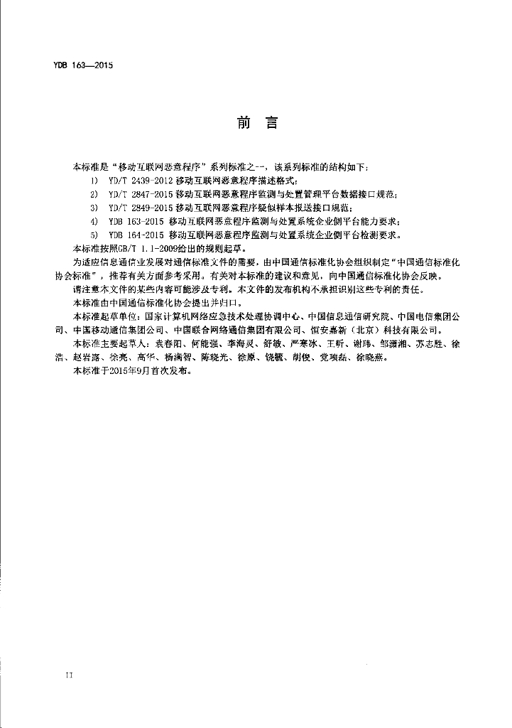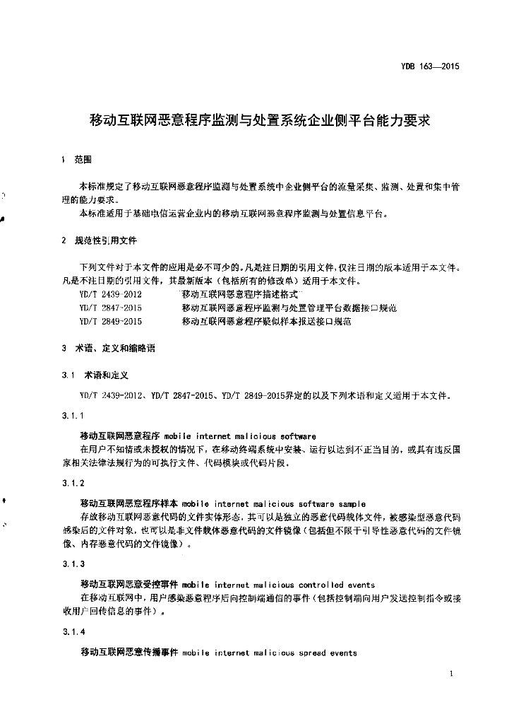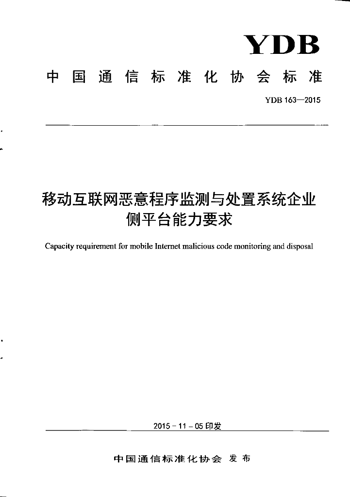 YDB 163-2015 移动互联网恶意程序监测与处置系统企业侧平台能力要求