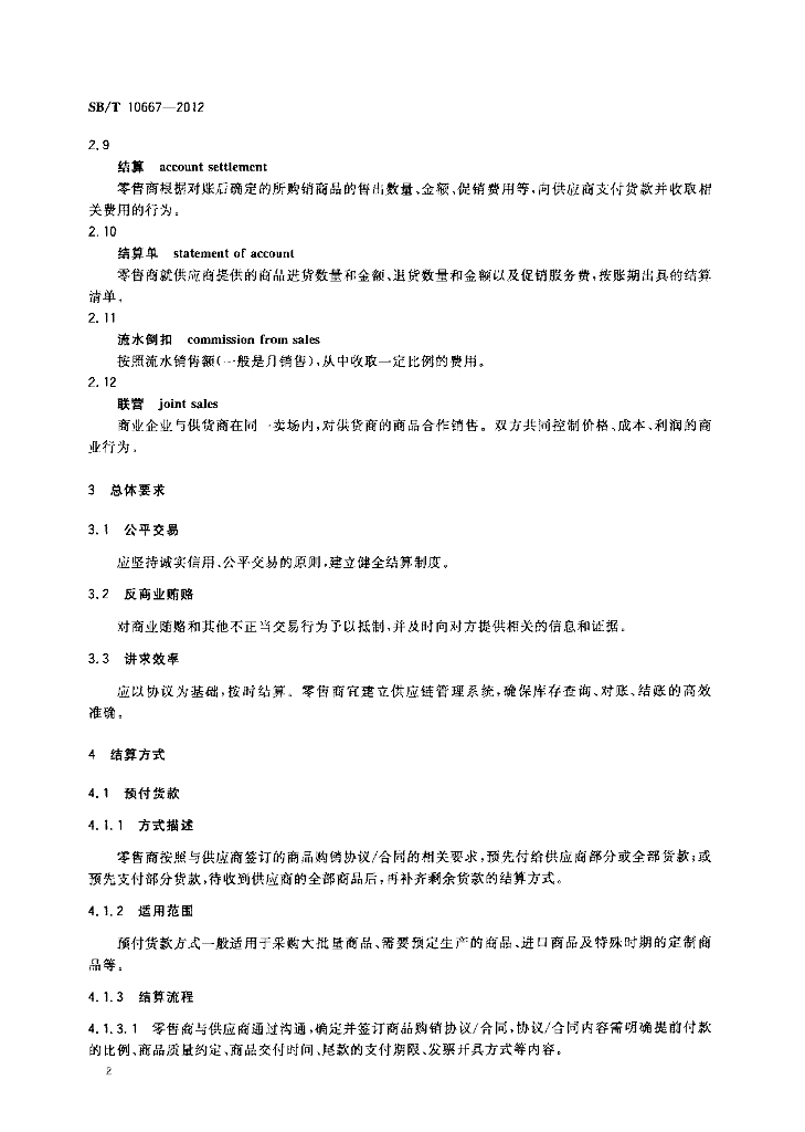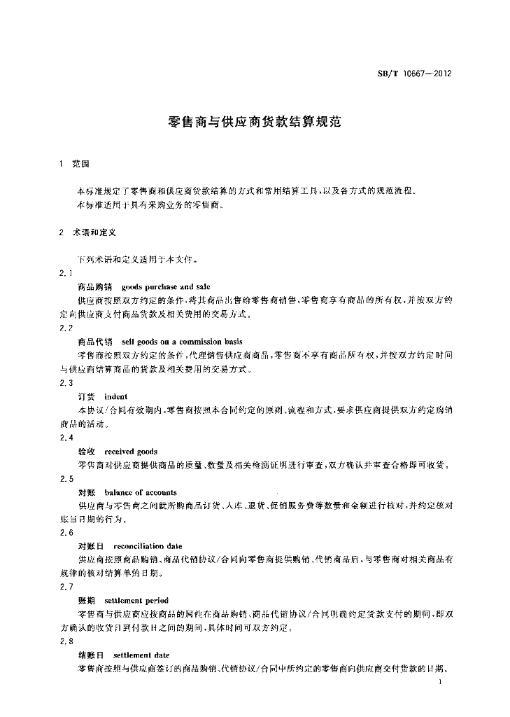SB/T 10667-2012 零售商与供应商货款结算规范