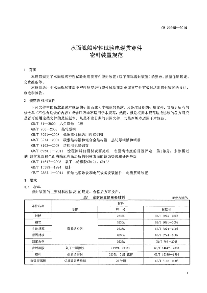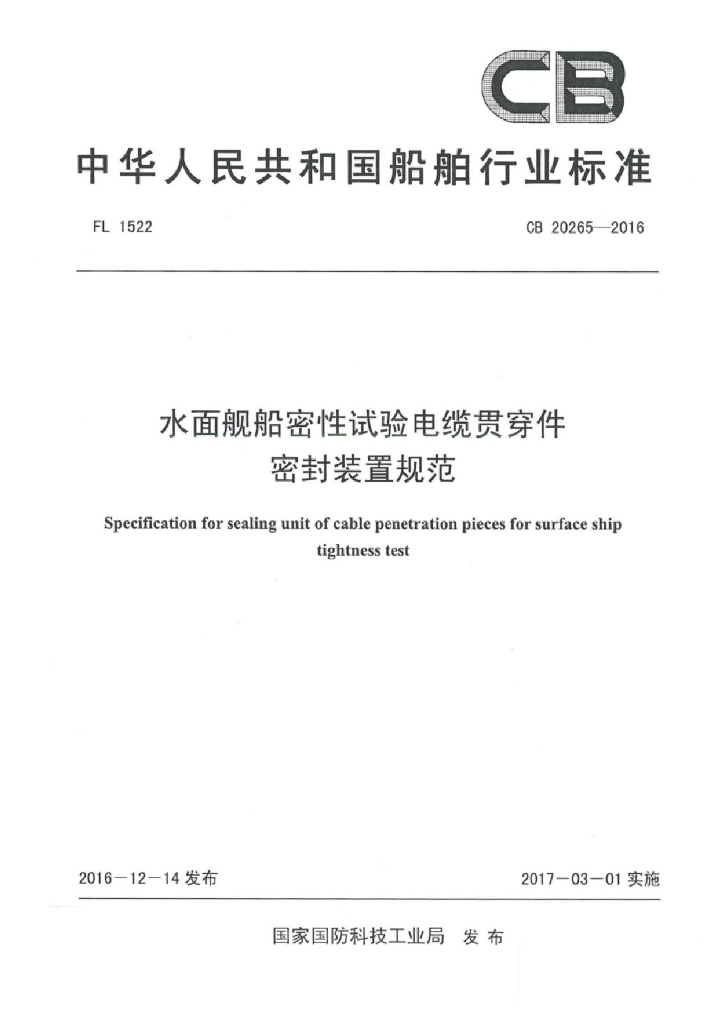 CB 20265-2016 水面舰船密性试验电缆贯穿件密封装置规范