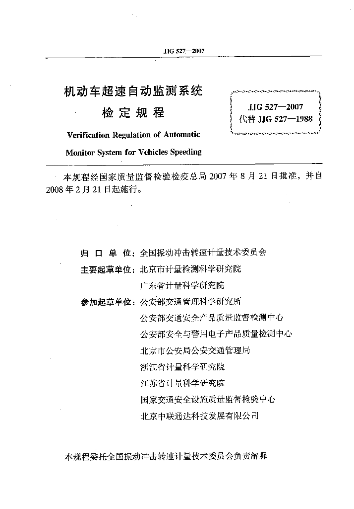 北京市计量检测科学研究院、广东省计量科学研究院、公安部交通管理科学研究所、公安部交通安全产品质量监督检测中心、公安部安全与警用电子产品质量检测中心、北京市公安局公安交通管理局、浙江省计量科学研究院、江苏省计量科学研究院、国家交通安全设施质量监督检验中心、北京中联通达科技发展有限公司