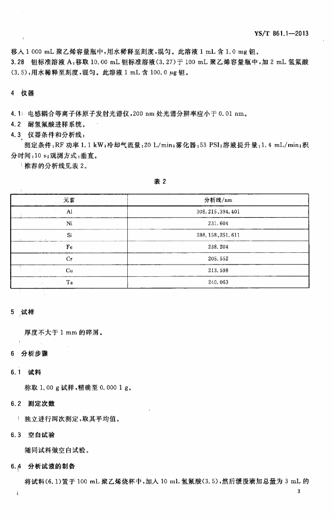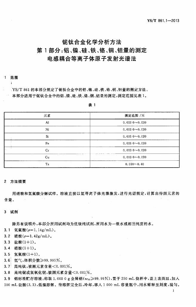 YS/T 861.1-2013 铌钛合金化学分析方法 第1部分:铝、镍、硅、铁、铬、铜、钽量的测定 电感耦合等离子体原子发射光谱法