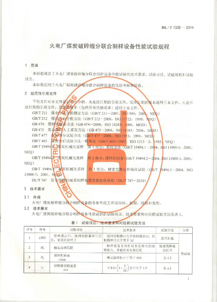 DL/T 1339-2014 火电厂煤炭破碎缩分联合制样设备性能试验规程