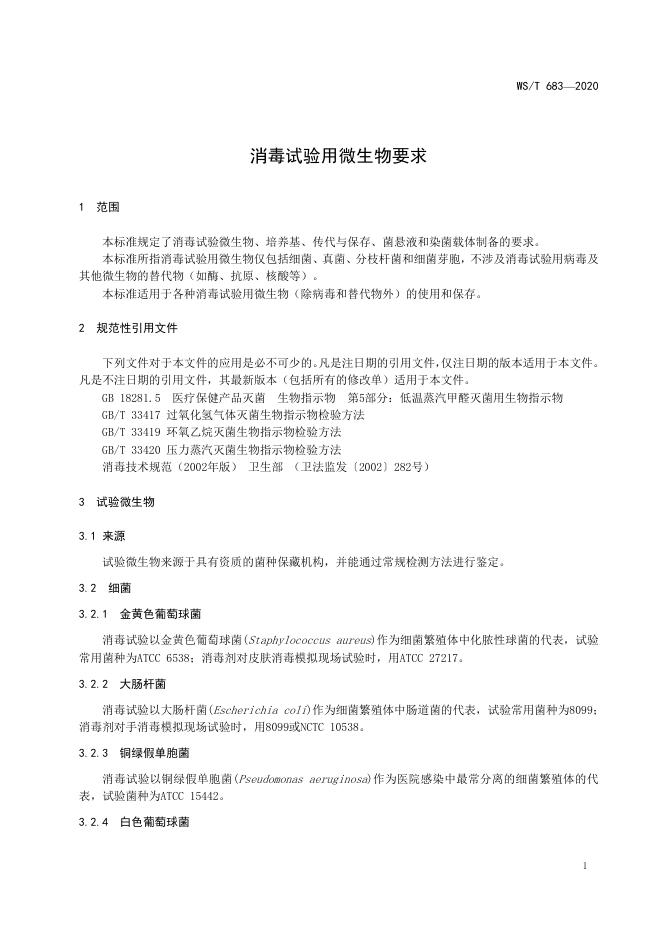 WS/T 683-2020 消毒试验用微生物要求