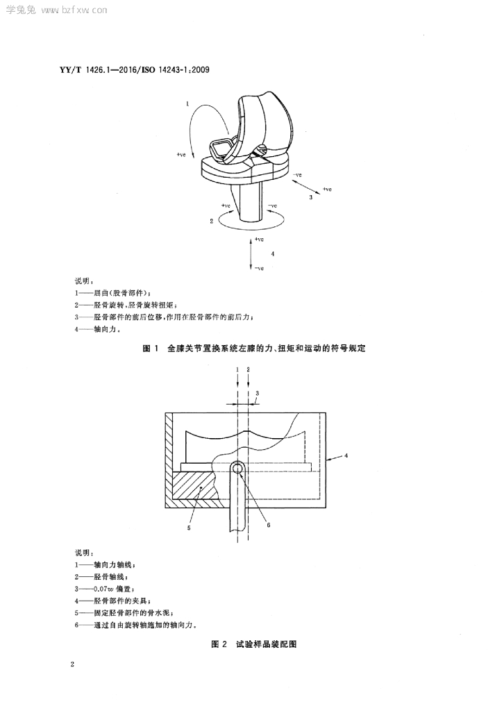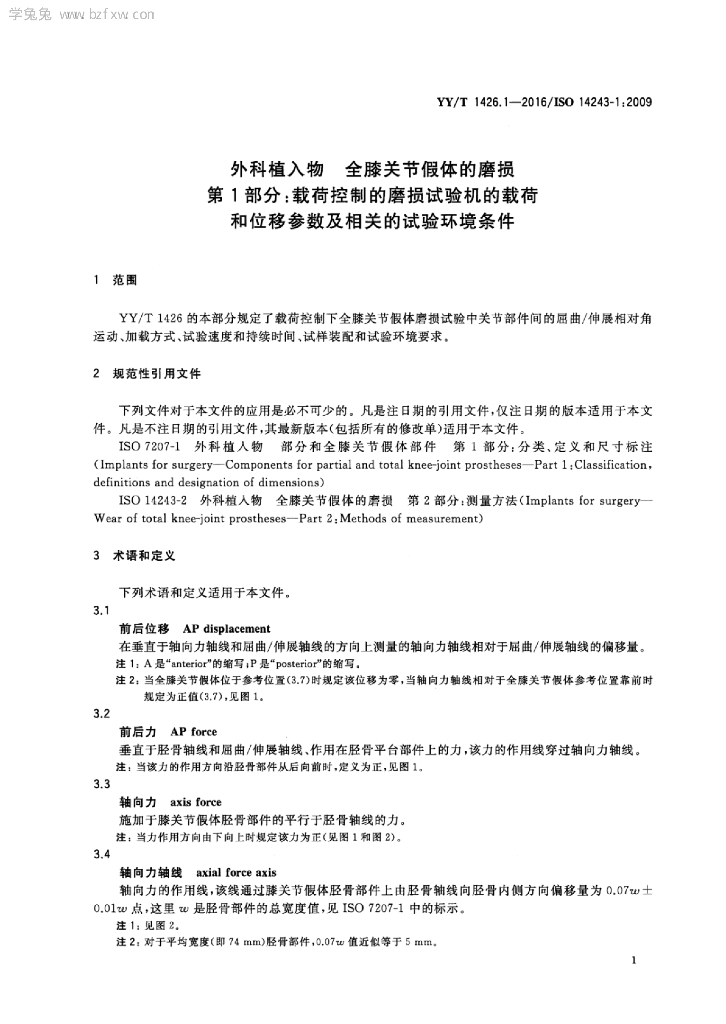 YY/T 1426.1-2016/ISO 14243-1:2009 外科植入物全膝关节假体的磨损 第1部分:载荷控制的磨损试验机的载荷和位移参数及相关的试验环境条件