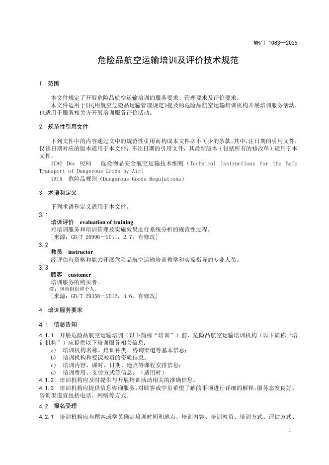 MH/T 1083-2025 危险品航空运输培训及评价技术规范
