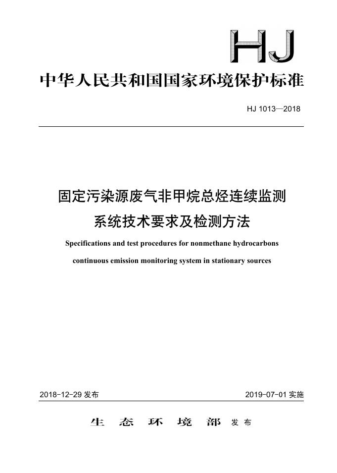 HJ 1013-2018 固定污染源废气非甲烷总烃连续监测系统技术要求及检测方法