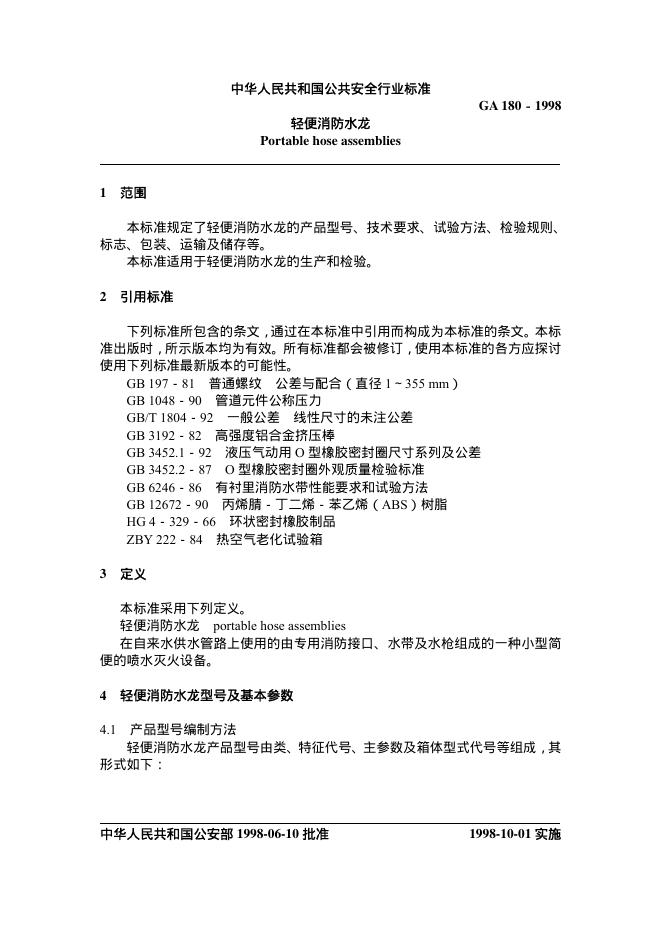 GA 180-1998 轻便消防水龙