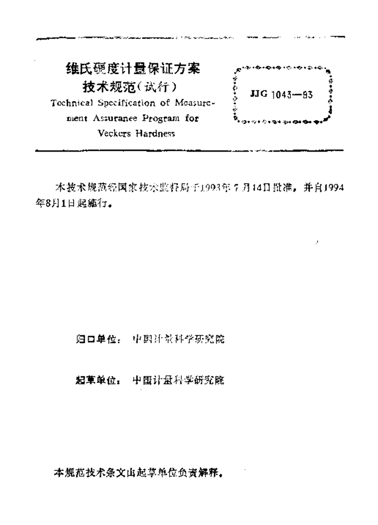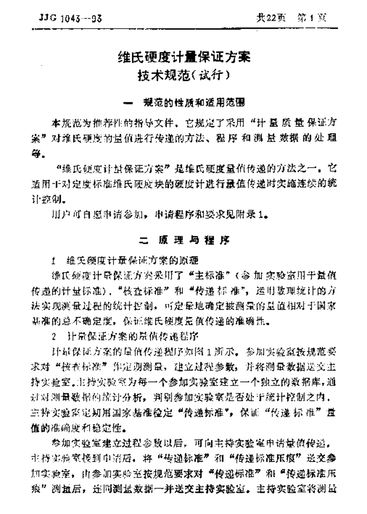 JJF 1043-1993 维氏硬度计量保护保证方案技术规范