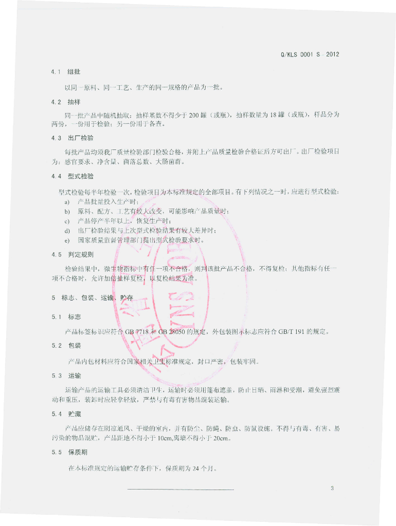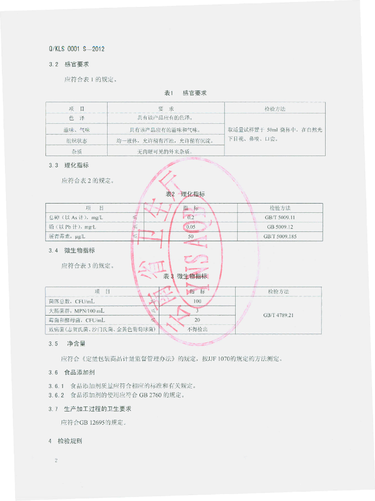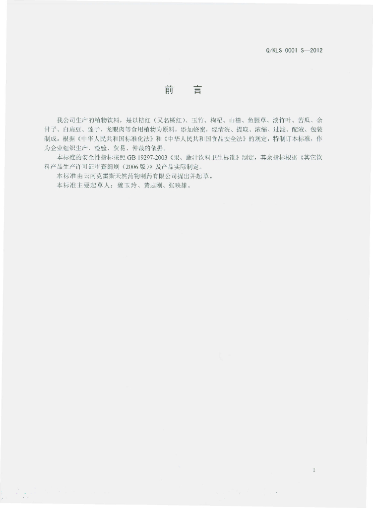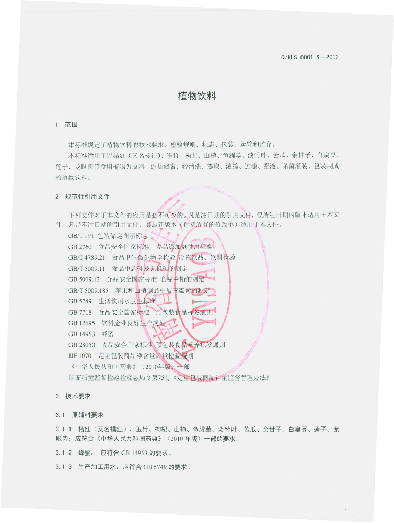Q/KLS 0001S-2012 植物饮料