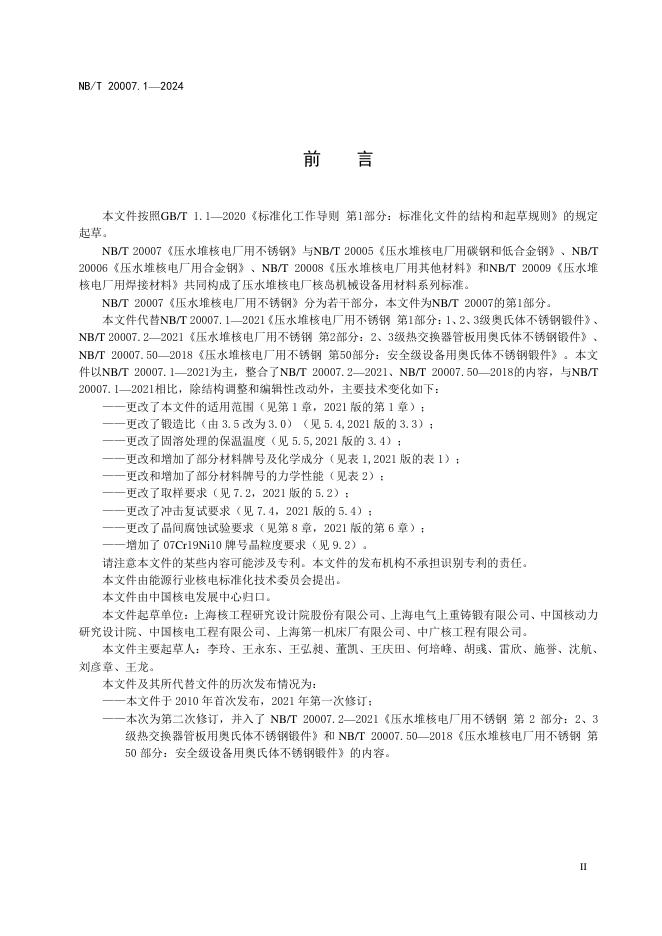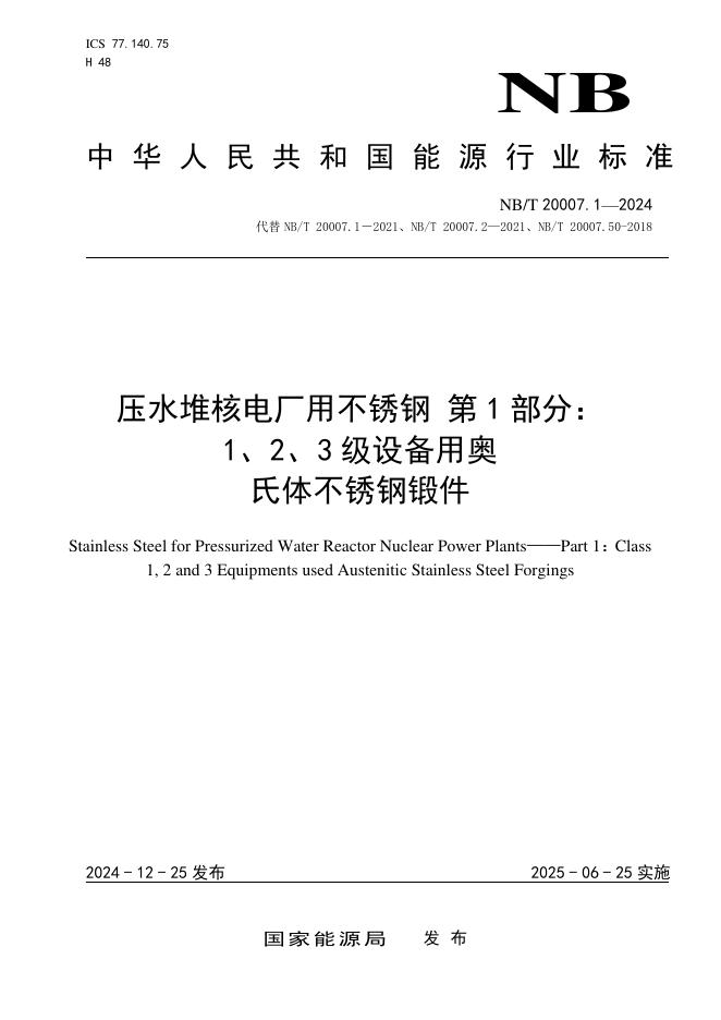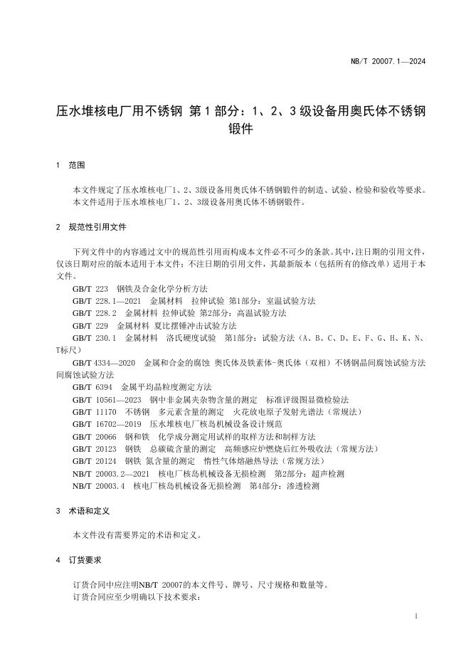 NB/T 20007.1-2024 压水堆核电厂用不锈钢 第1部分:1、2、3级设备用奥氏体不锈钢锻件