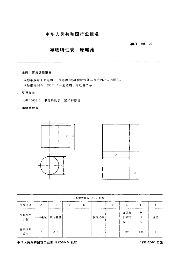 QB/T 1495-1992 事物特性表原电池