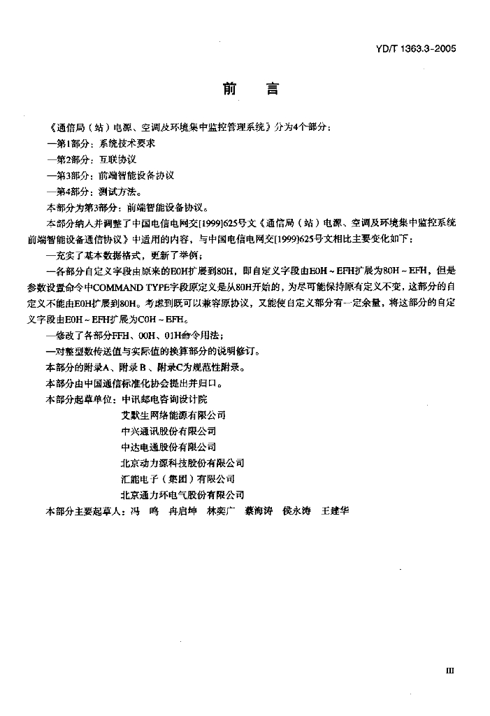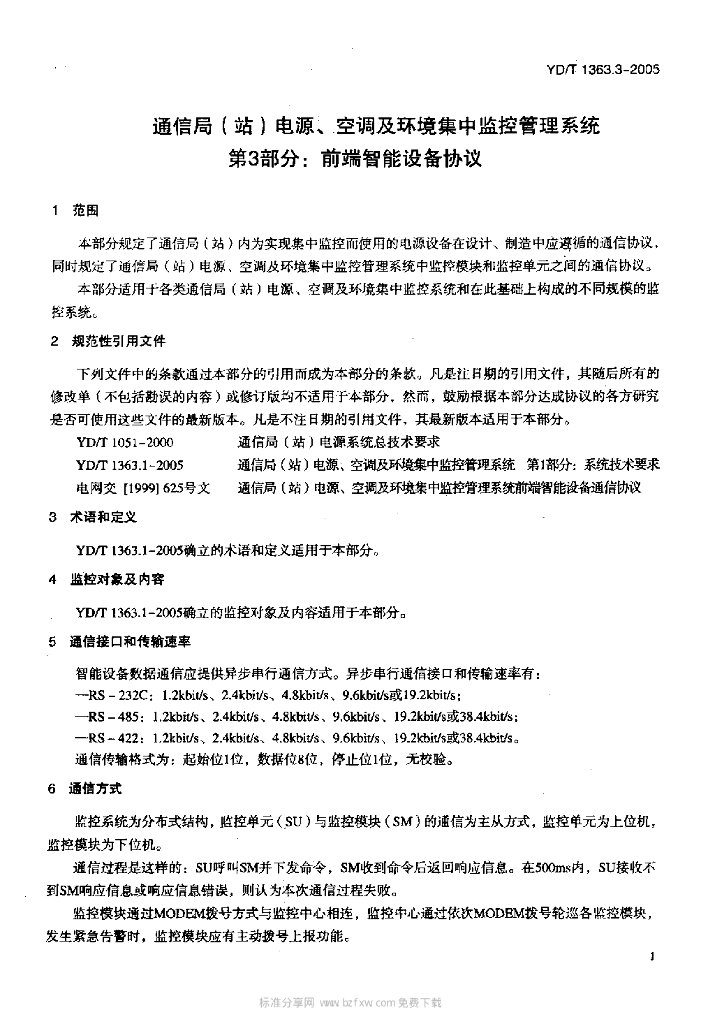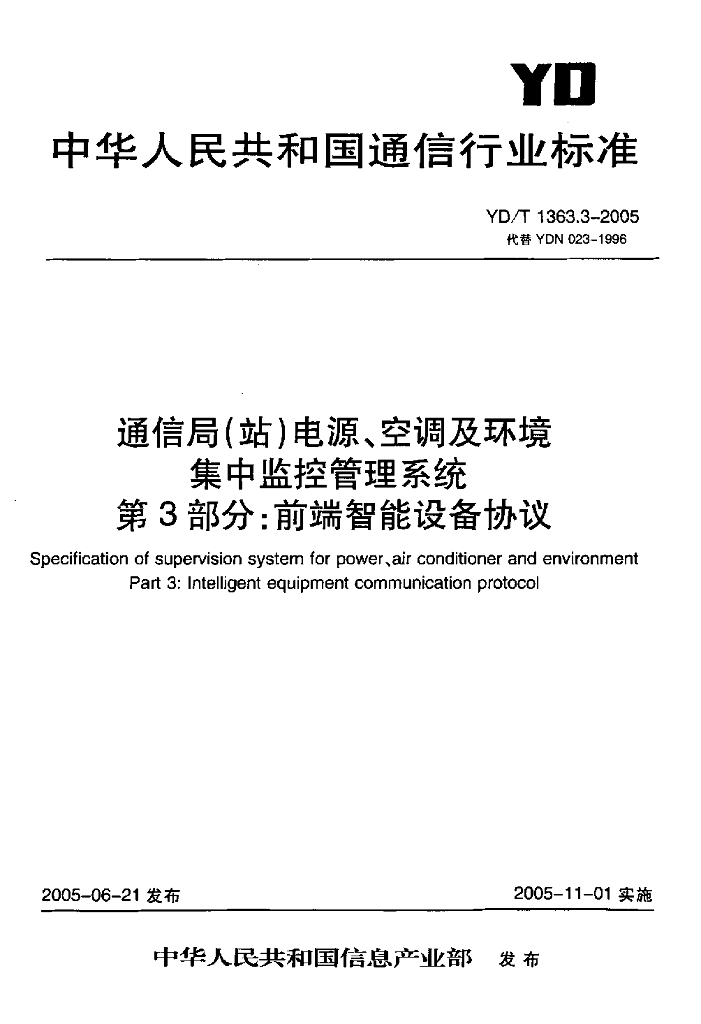 YD/T 1363.3-2005 通信局(站)电源、空调及环境集中监控管理系统 第3部分:前端智能设备协议