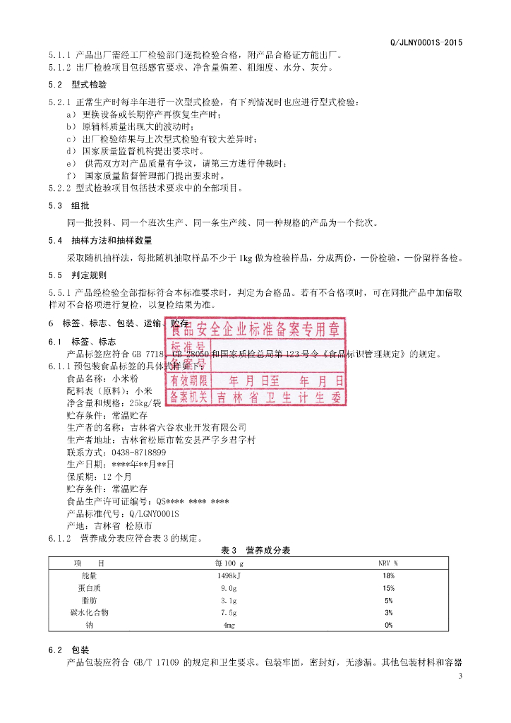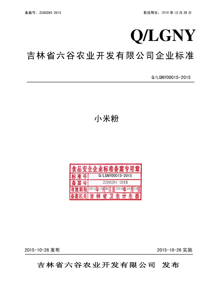 Q/LGNY 0001S-2015 吉林省六谷农业开发有限公司 小米粉