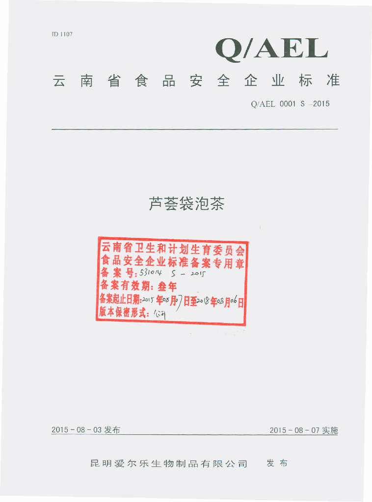 Q/AEL 0001S-2015 昆明爱尔乐生物制品有限公司 芦荟袋泡茶