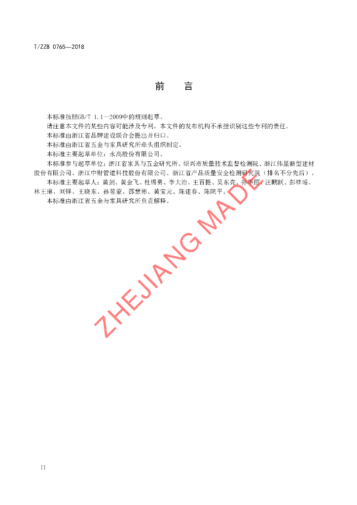 永高股份有限公司、浙江省家具与五金研究所、绍兴市质量技术监督检测院、浙江伟星新型建材股份有限公司、浙江中财管道科技股份有限公司、浙江省产品质量安全检测研究院