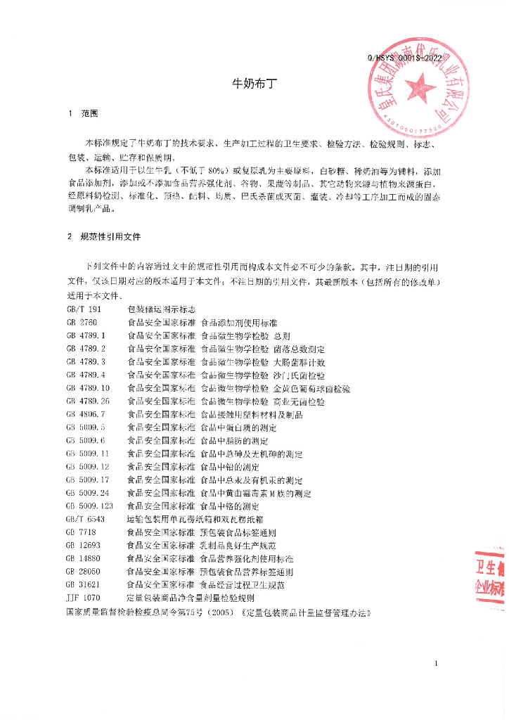 Q/HSYS 0001S-2022 牛奶布丁