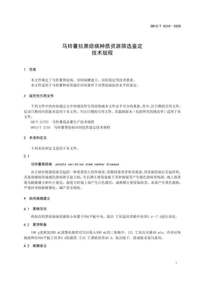 DB15/T 4316-2026 马铃薯抗黑痣病种质资源筛选鉴定技术规程