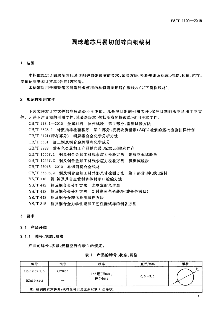 YS/T 1100-2016 圆珠笔芯用易切削锌白铜线材