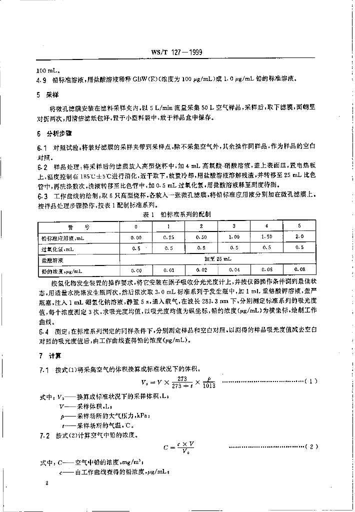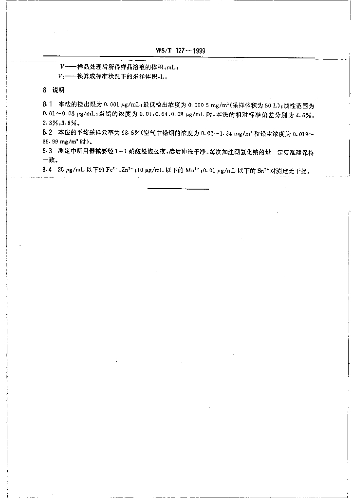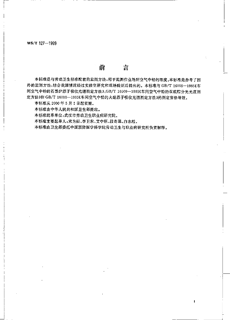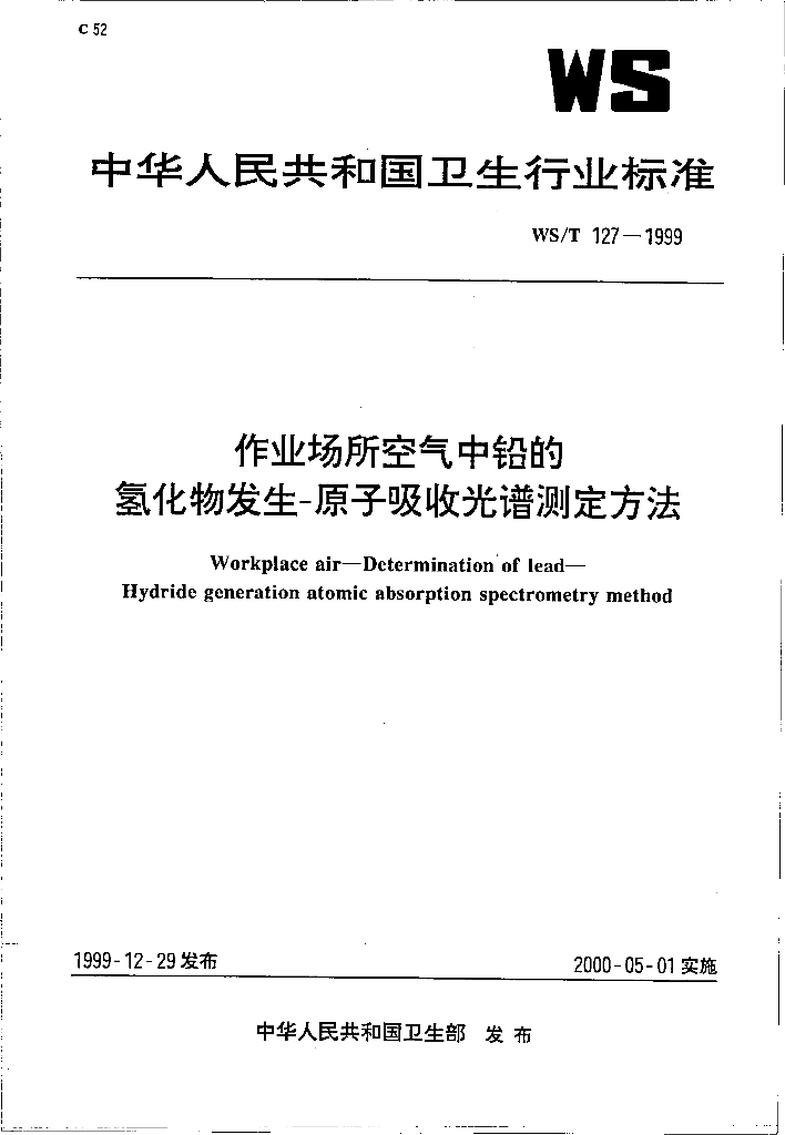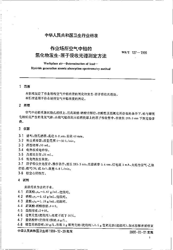 WS/T 127-1999 作业场所空气中铅的氢化物发生-原子吸收光谱测定
