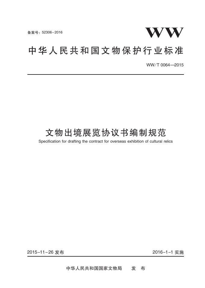WW/T 0064-2015 文物出境展览协议书编制规范