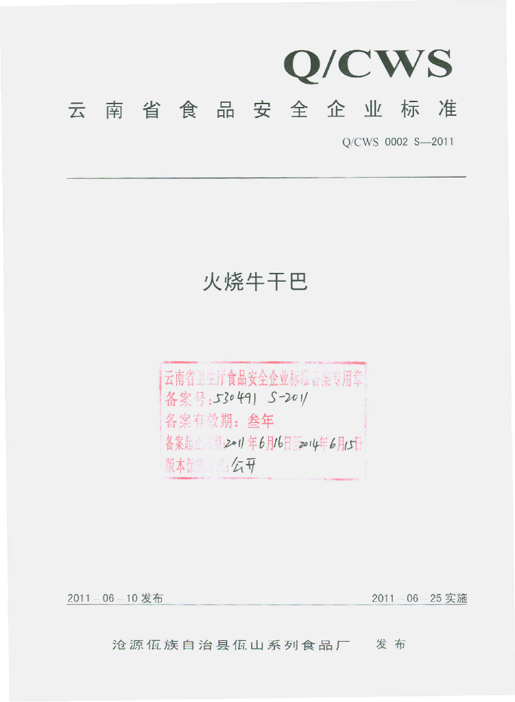 Q/CWS 0002S-2011 火烧牛干巴