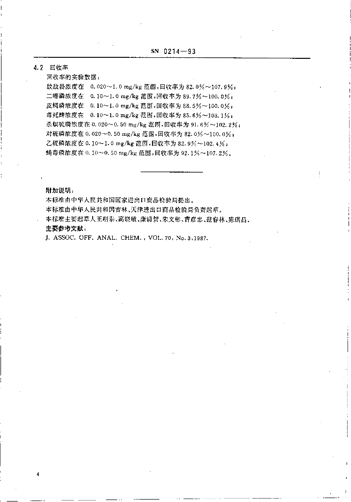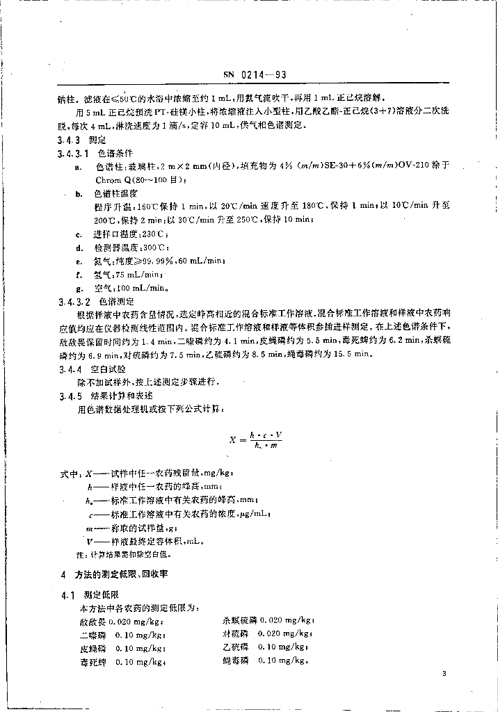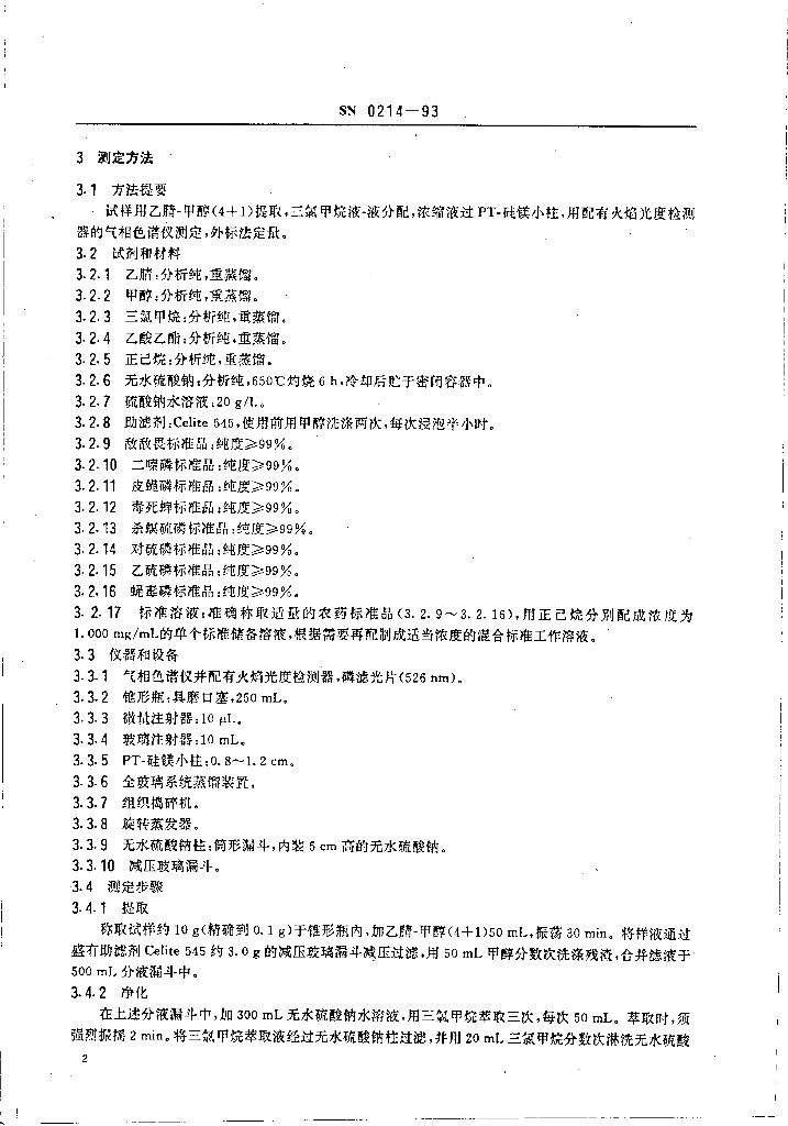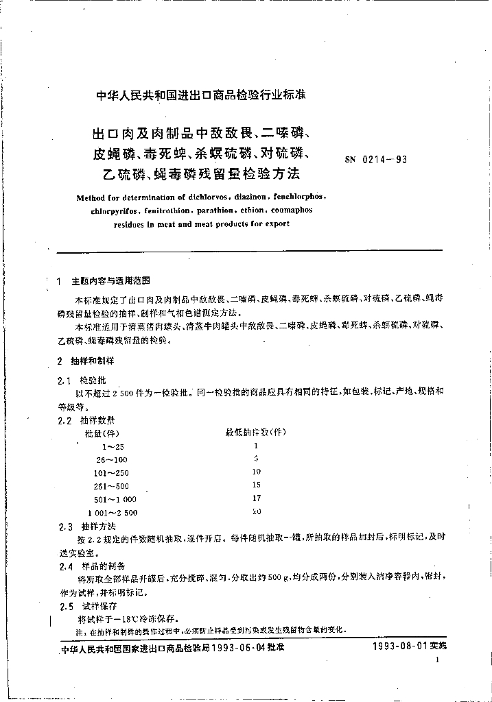 SN 0214-1993 出口肉及肉制品中敌敌畏、二嗪磷、皮蝇磷、毒死蜱、杀螟硫磷、对硫磷、乙硫磷、蝇毒磷残留量检验方法